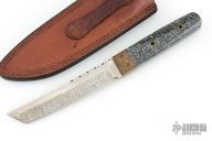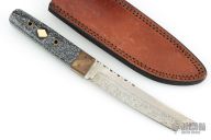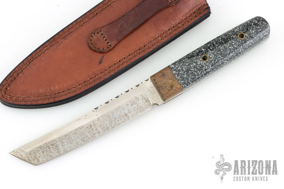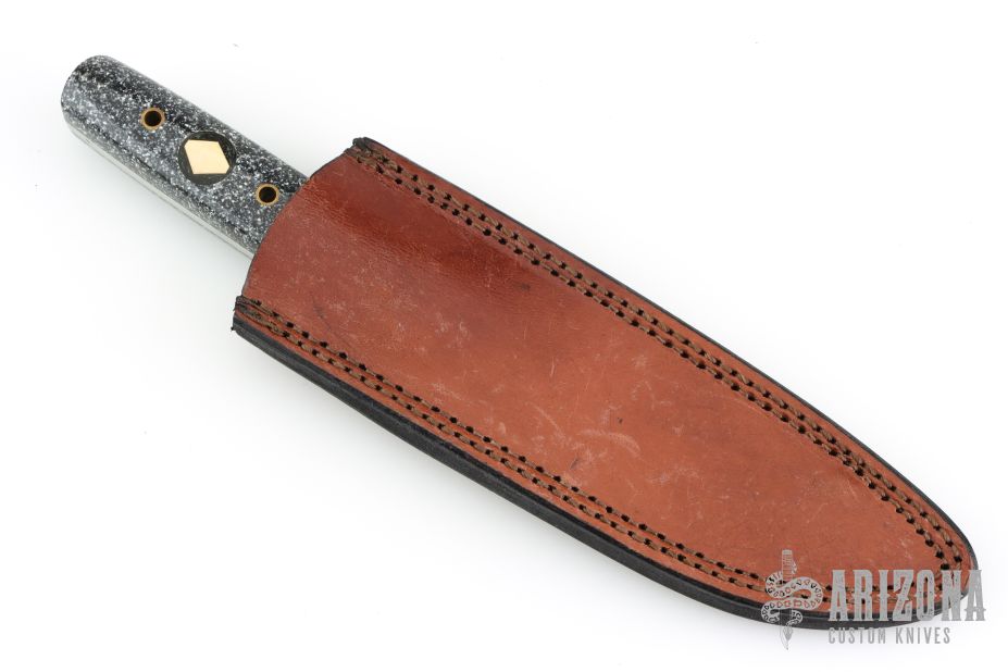 This knife by Bob Holly features a two-tone satin finish blade with .166" blade stock, 1.045" blade depth, and full tang construction. File-worked thumb rest, textured bronze bolsters, corian covers, and brass tubes. Comes with leather belt sheath. Has a couple light scratches, excellent condition. Dated 2001.
