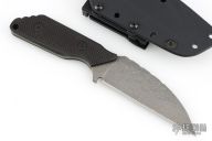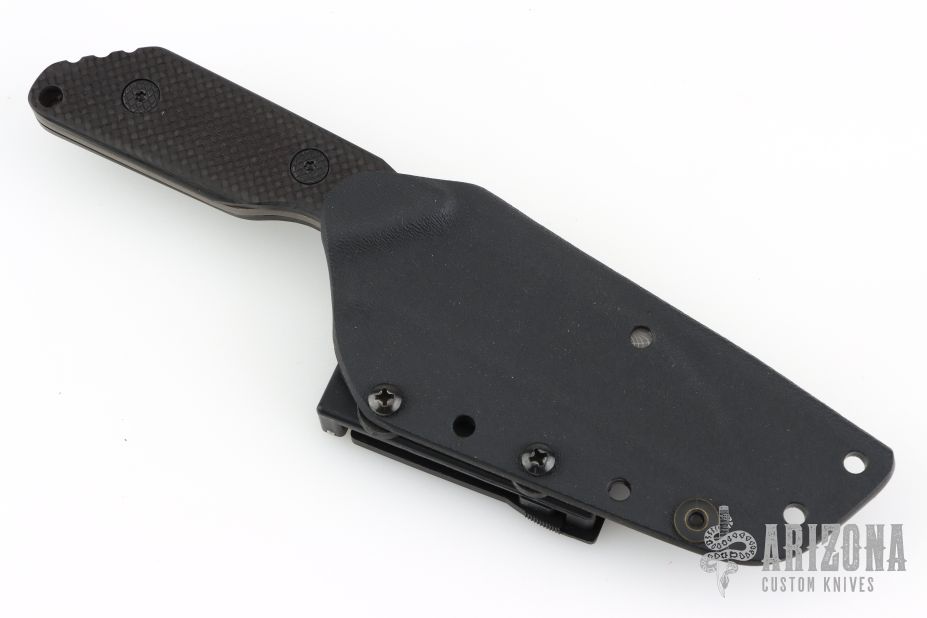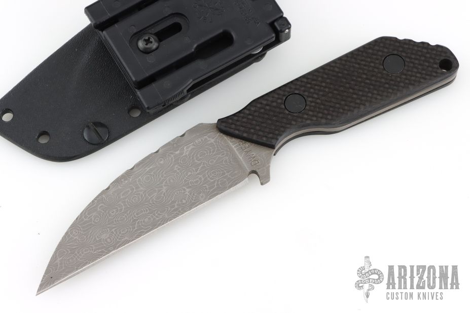 This Knife by Duane Dwyer features a Vines/Roses pattern (looks like) Damascus blade with .133" blade stock and 1.32" blade depth, full tang with black carbon fiber scales. Comes with Kydex sheath and clip. Has some light scuffs, excellent condition.