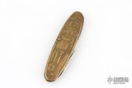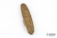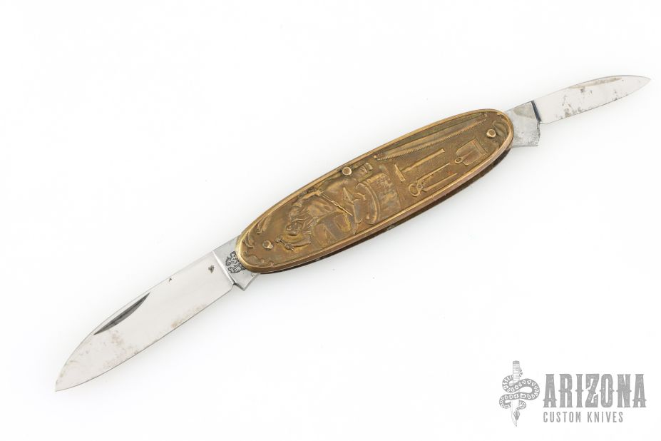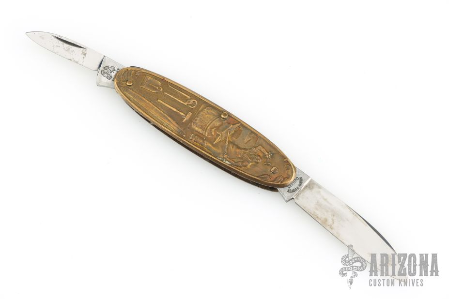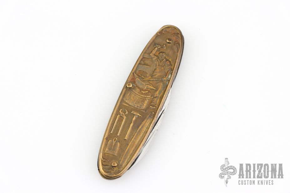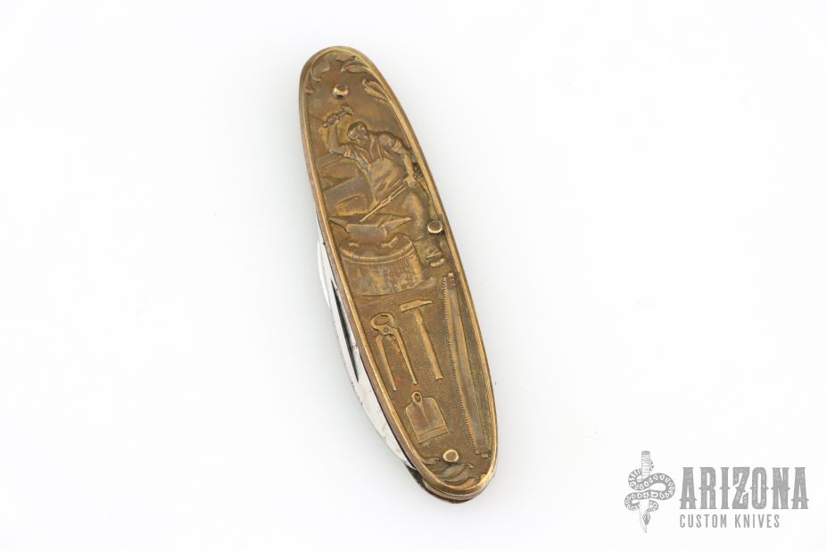 This slipjoint by Fight'n Rooster features mirror finished blades with nail nicks. The handle has cast brass covers with blacksmithing motif, and stainless steel spring. Has some scratches, great condition for its age.
