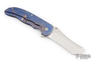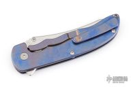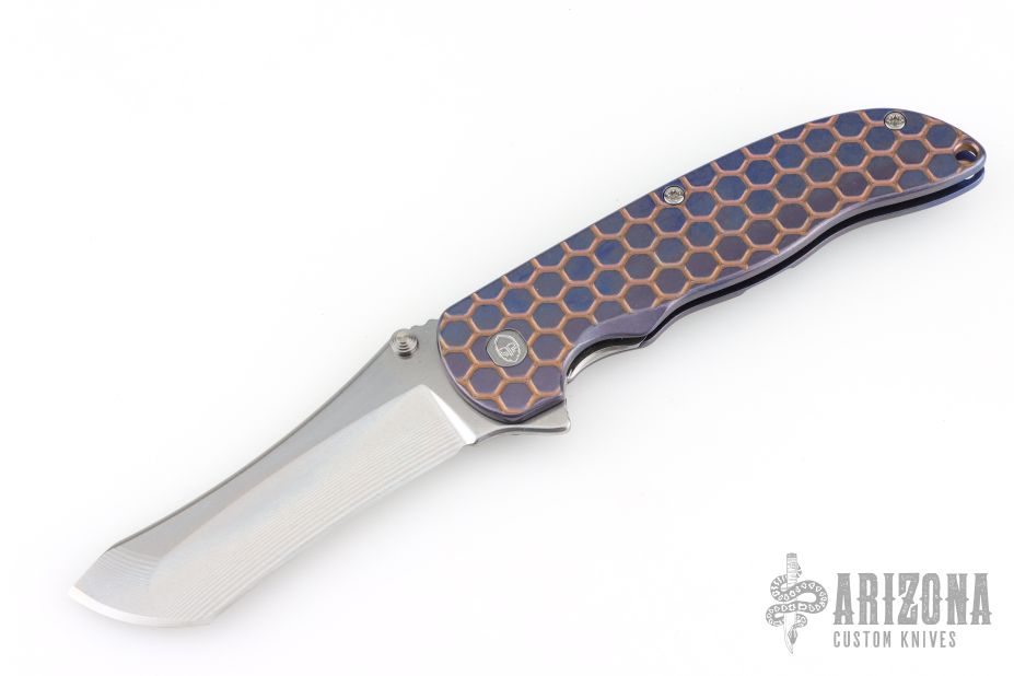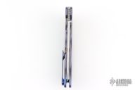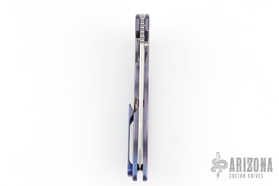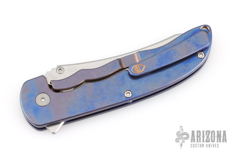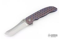 This Norseman (#7905) by John Grimsmo features a tumbled blade with a single titanium thumbstuds, notched thumb ramp and flipper. Stonewashed and anodized titanium frame with a reverse honeycomb pattern front scale and titanium screws. Matching tip up pocket clip.  Very smooth action that requires no wrist movement. Nice detent, lockup and blade seating. Rides on ceramic bearings. Comes with original box and COA dated December 3, 2024. Excellent condition.