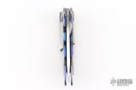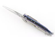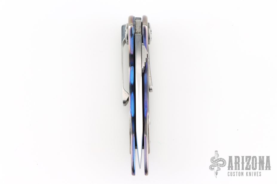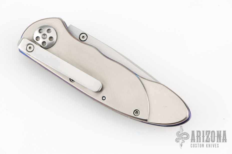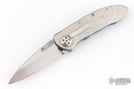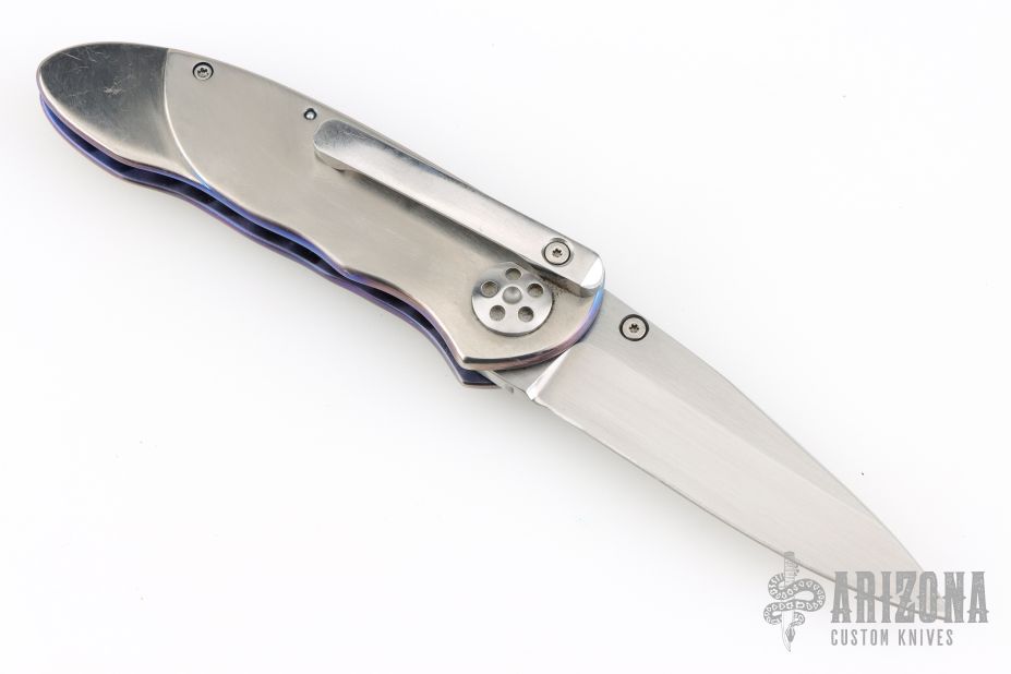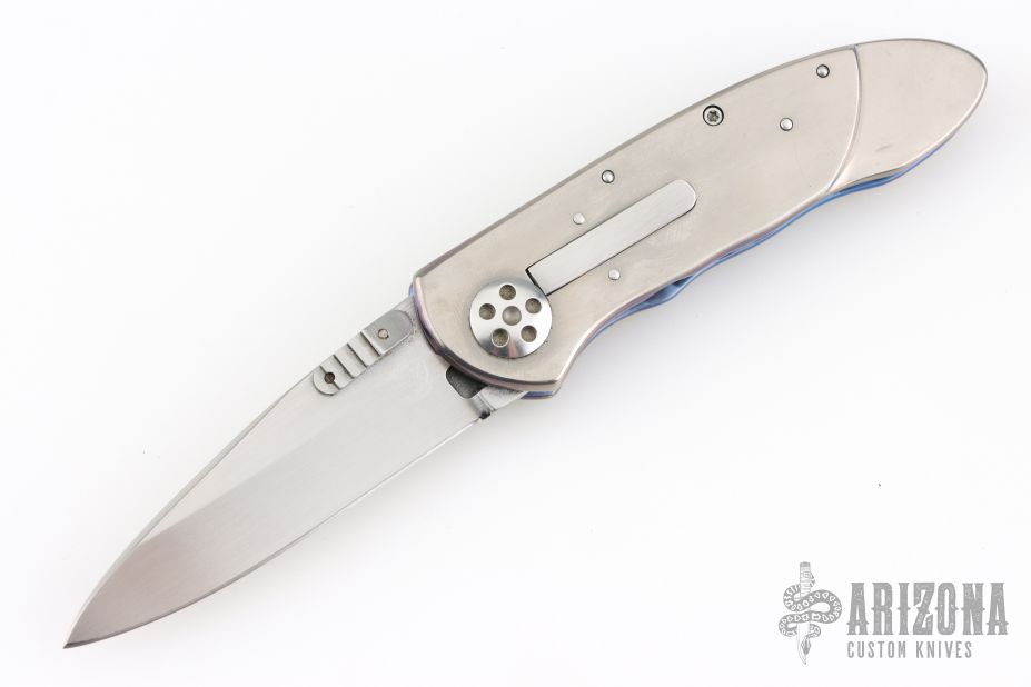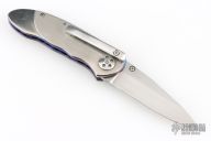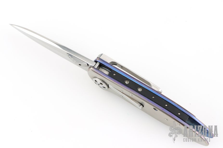 This Small Emperor from Allen Elishewitz features a drop point hand rub satin finished blade with single stepped thumbstud. The handle is comprised of anodized and satin finished titanium frame over a black G-10 backspacer. Stainless steel tip down pocket clip. Good blade seating and lock up. Includes a zippered case. Has scratches, otherwise good condition.