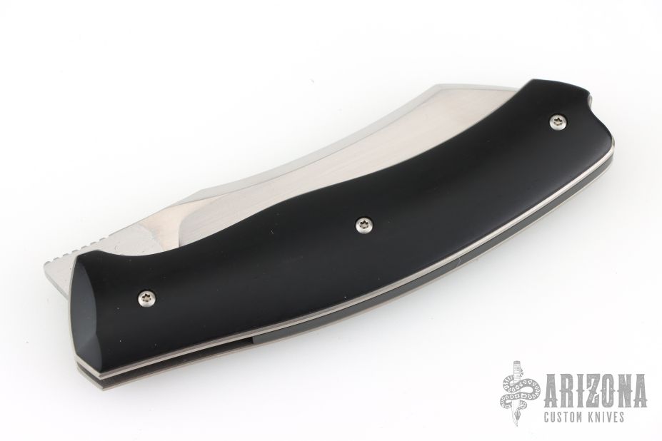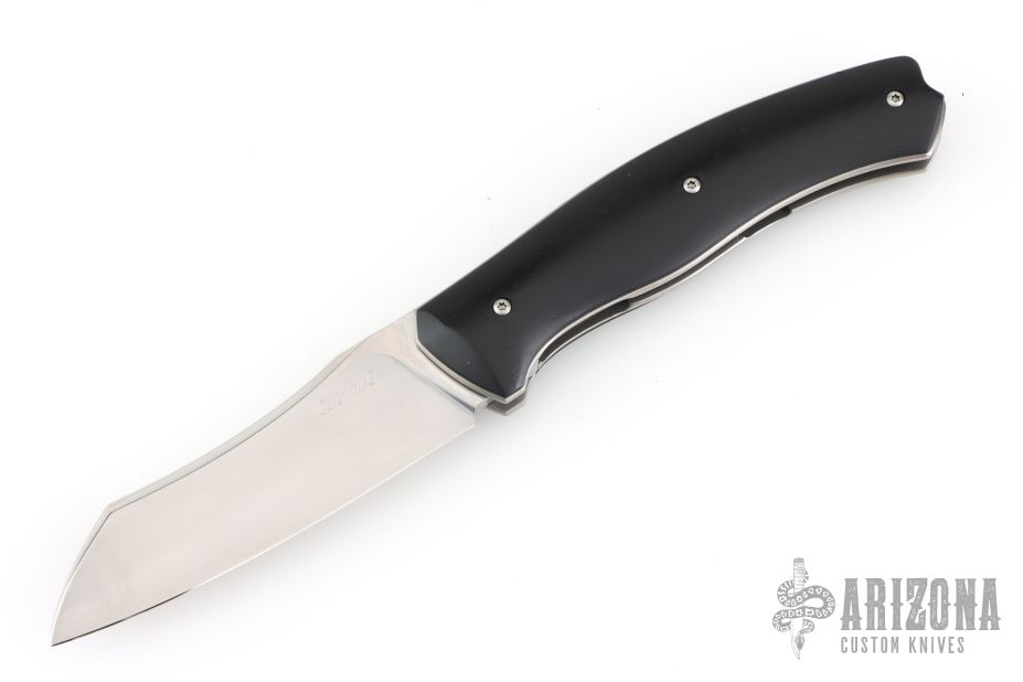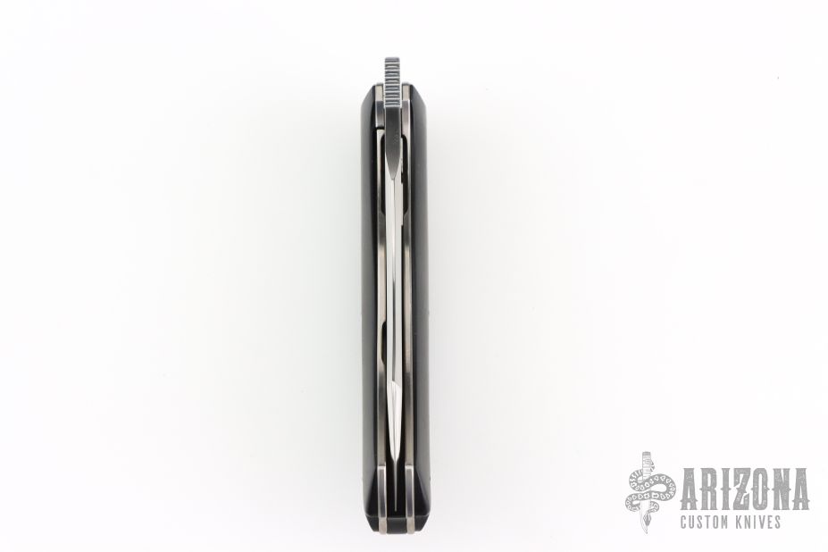This Bluff Linerlock Front Flipper by Ouertal Olivier features a hand rub satin finished blade with notched front flipper. The handle has stabilized black hornbeam wood scales, satin titanium liners, black Bakelite backspacer. Comes with a zippered case and COA. Has one little ding in one of the scales, otherwise excellent condition.