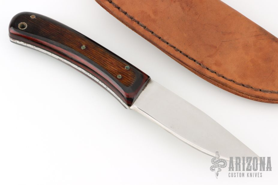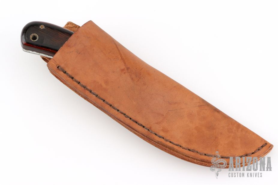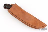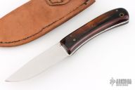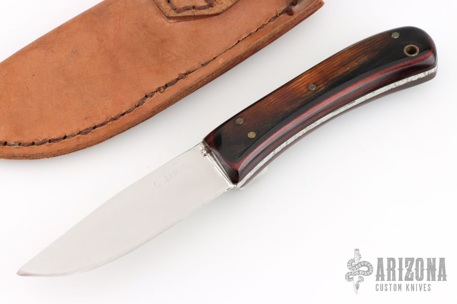 This knife by C James features a satin polished blade with .136" blade stock and 1.210" blade depth, full tang construction. The handle has dymondwood scales with brass pins and lanyard hole. Comes with a brown leather sheath. Has some oxidation spots on the tang and ricasso, otherwise good condition.