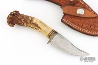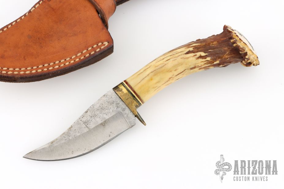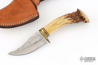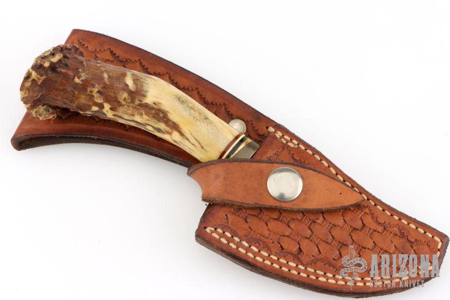 This Skinner by Ken Richardson features an upswept blade with jeweled flats and satin grinds, notched thumbrest, .062" blade stock and 1.190" blade depth, hidden tang construction. The handle has a brass guard and crown stag grip, red/white/black spacers. Has a scrimshawed deer on the butt of the handle. Comes with a hand tooled brown leather sheath. Has some oxidation spots on the blade, otherwise good user condition.