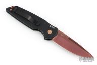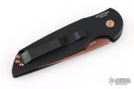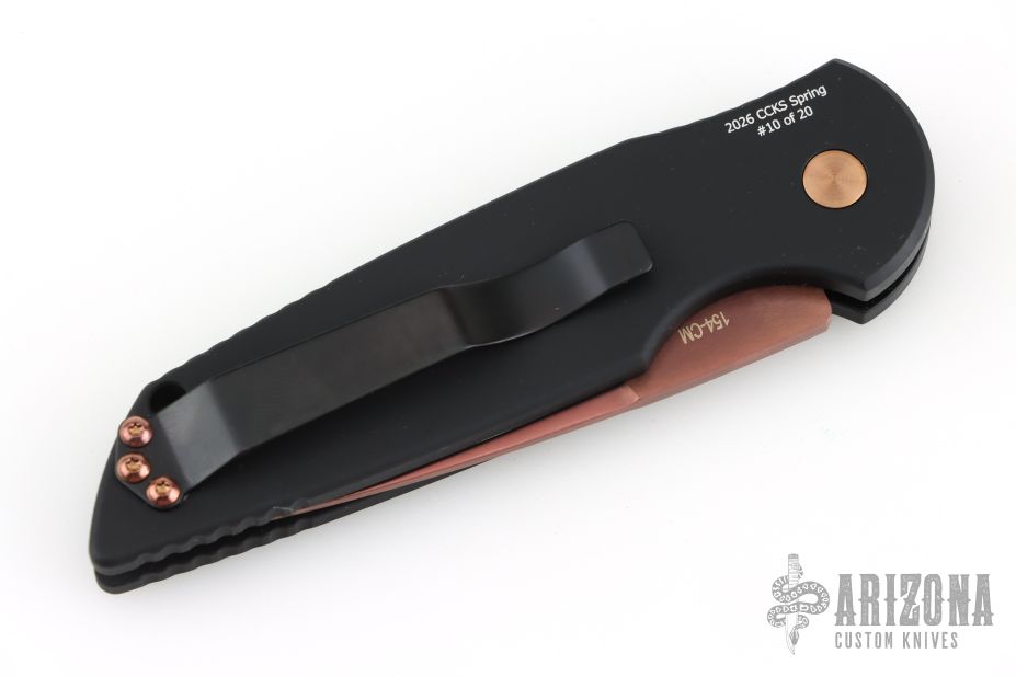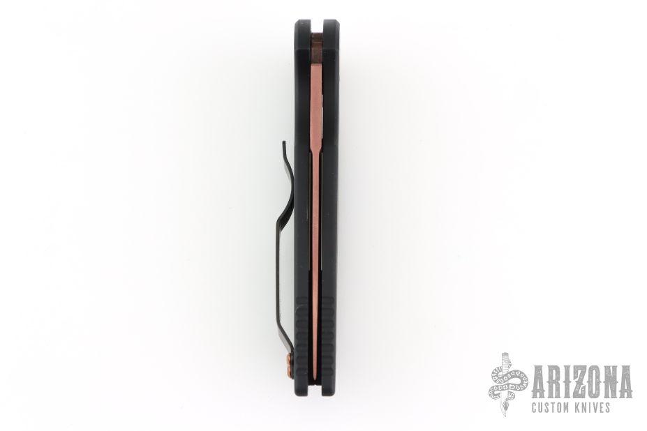 This TR-3 has a copper rose PVD blade with a plain edge, and black grooved handle, copper rose hardware, black stainless steel clip, tip up carry. Comes with original box and papers. #10 of 20. New from the 2026 CCKS.