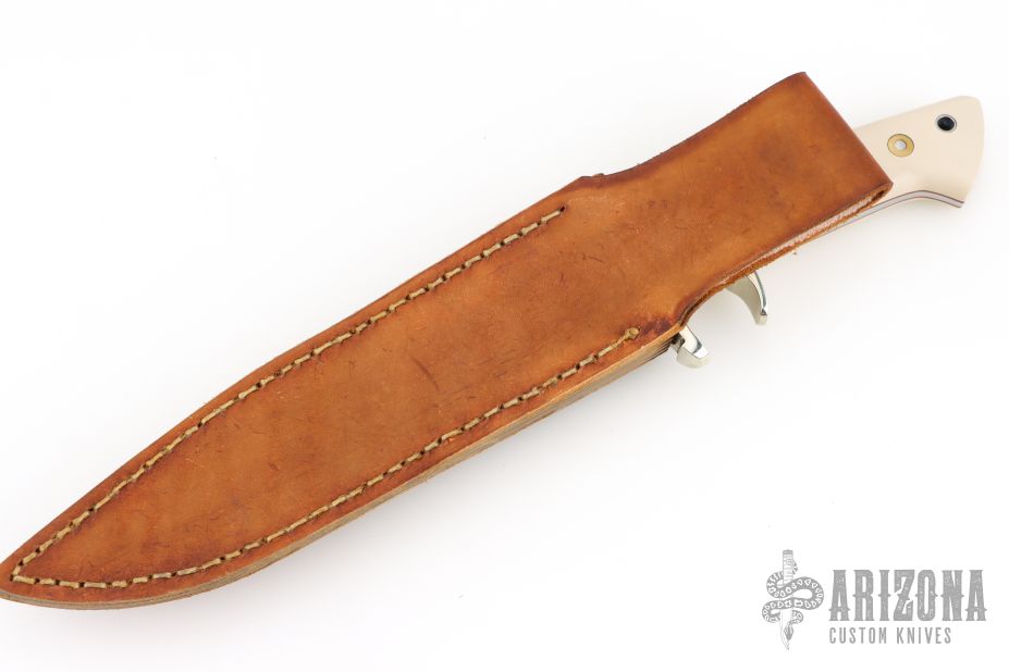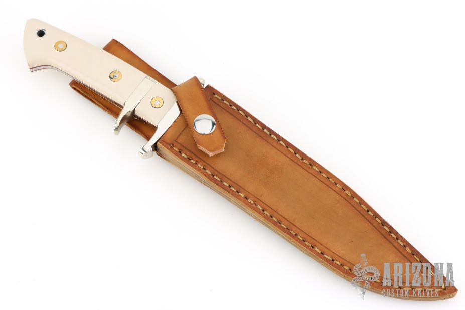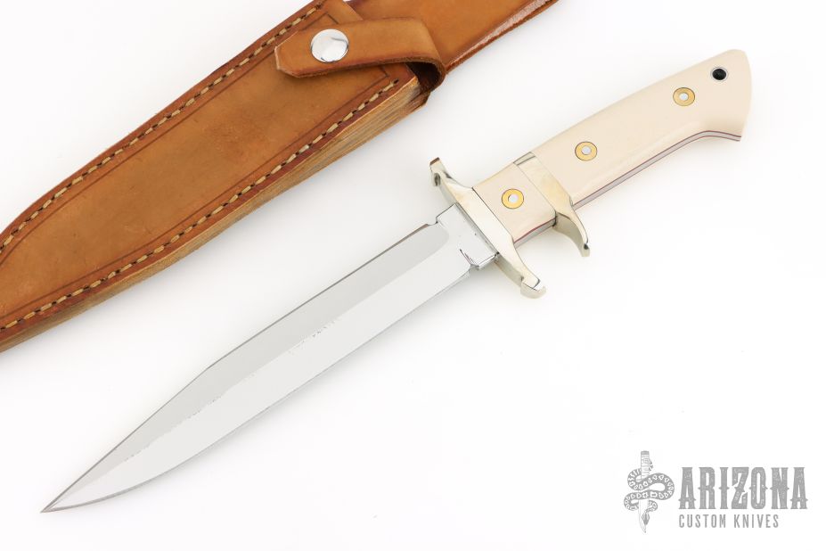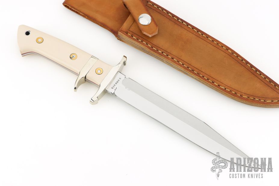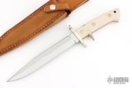 This Sub Hilt Fighter from Steve Voorhis features a mirror polished clip point blade with sharpened top edge, .202" blade stock and 1.099" blade depth, full tapered tang construction. The handle is comprised of a nickel silver guard and sub hilt, ivory paper micarta scales over red liners. Comes with brown leather sheath. Excellent condition.