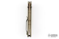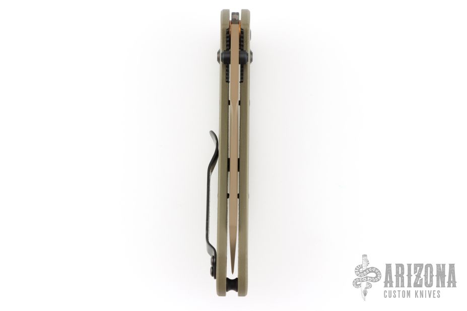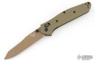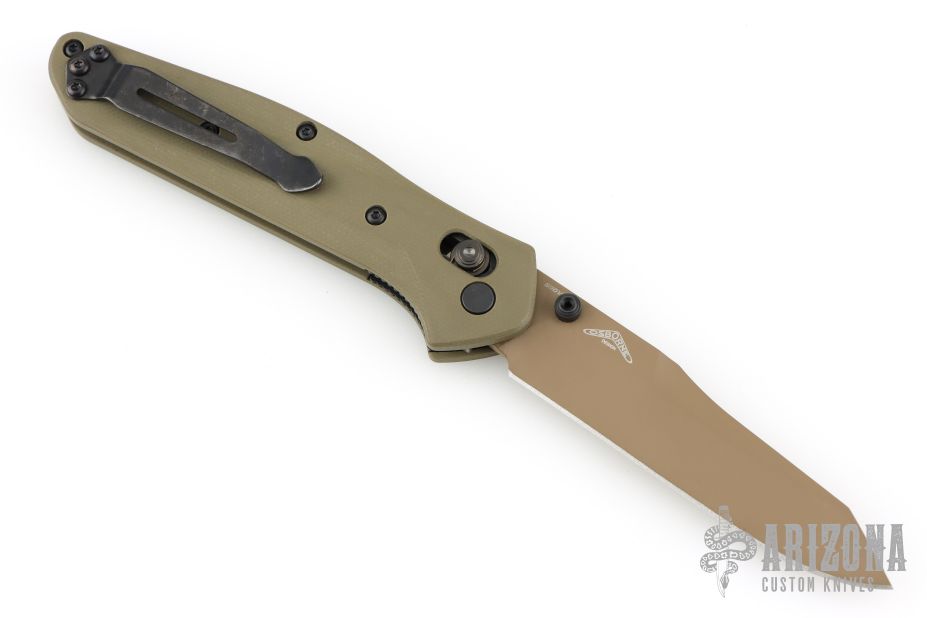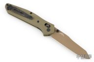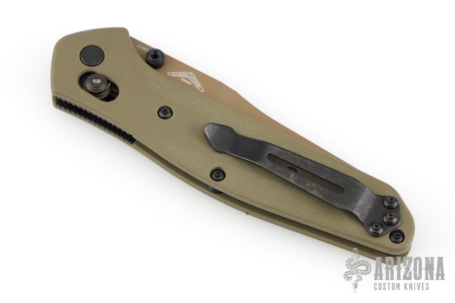 This 940BK Osborne Axis Lock Folder from Benchmade has a flat dark earth coated clip point blade with false top edge and dual thumbstuds. Handle is green G10 with a black finished stainless steel tip up clip (RH/LH Reversible). Nice blade seating and lockup. Comes with original box, papers and drawstring pouch. Excellent condition.