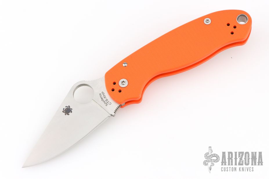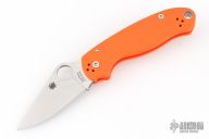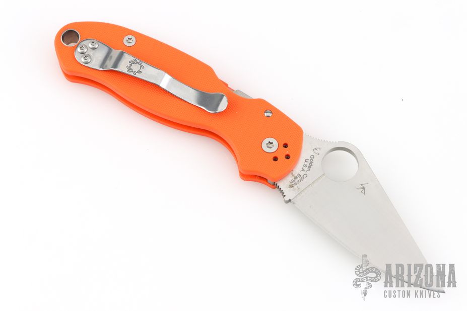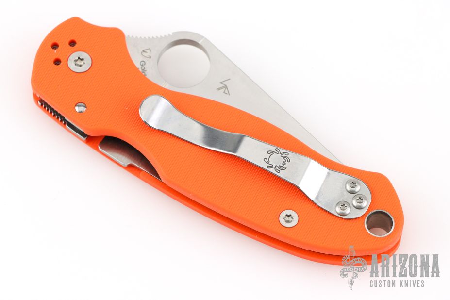 This C223GPOR Para 3 by Spyderco features a satin finished clip point blade with thumb hole and notched thumbrest. The handle is comprised of an orange G-10 frame over nested steel liner and stand offs. The steel pocket clip is 4 way adjustable. Includes original box and paperwork. Excellent condition.