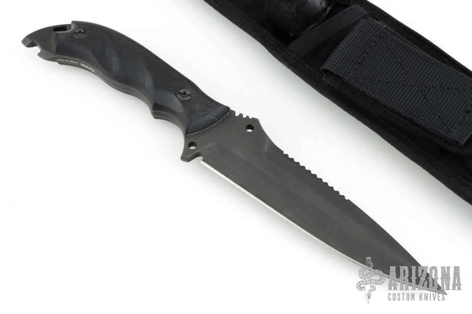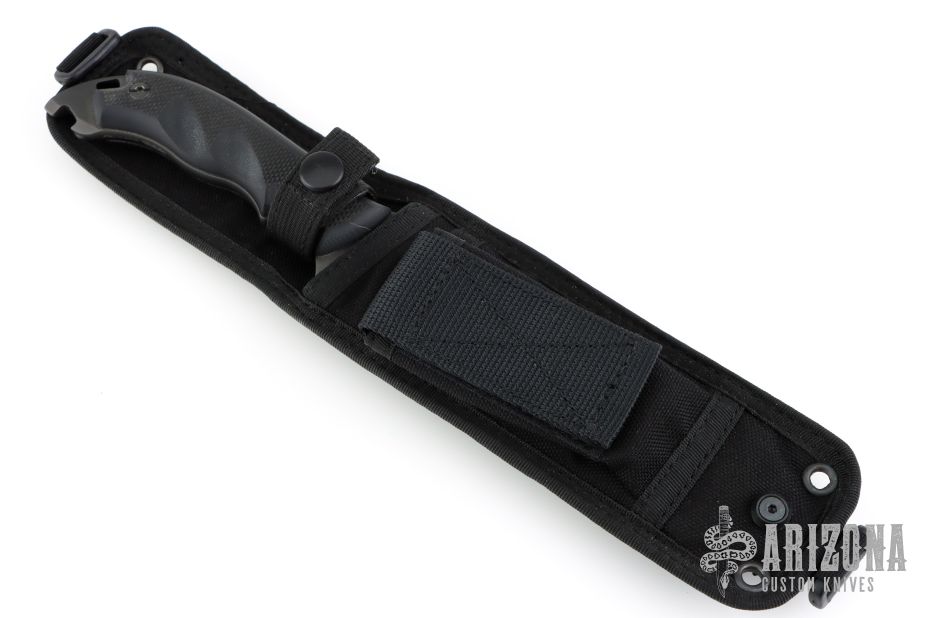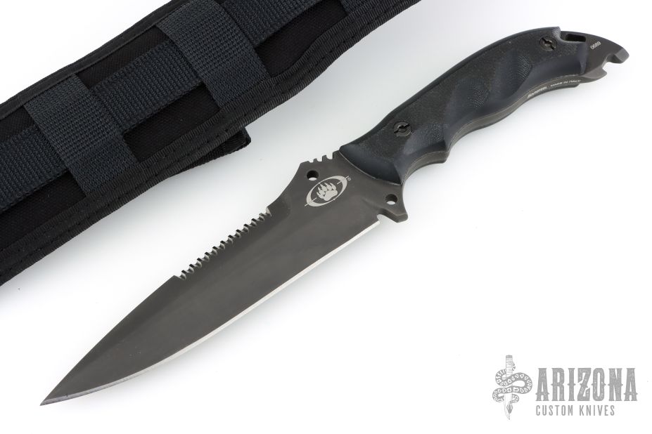 This URSA 6 from Blackwater Gear features a black coated spear point blade with false top edge, sawteeth along the spine and notched thumb rest designed as a wire stripper in the three most popular gauges, .237" blade stock and 1.618" blade depth. The handle is comprised of textured black G-10 over full tang construction. Pommel features lanyard hole, glass breaker and pry bar. Includes nylon sheath. Excellent condition. Comes with original box and papers. #0689
