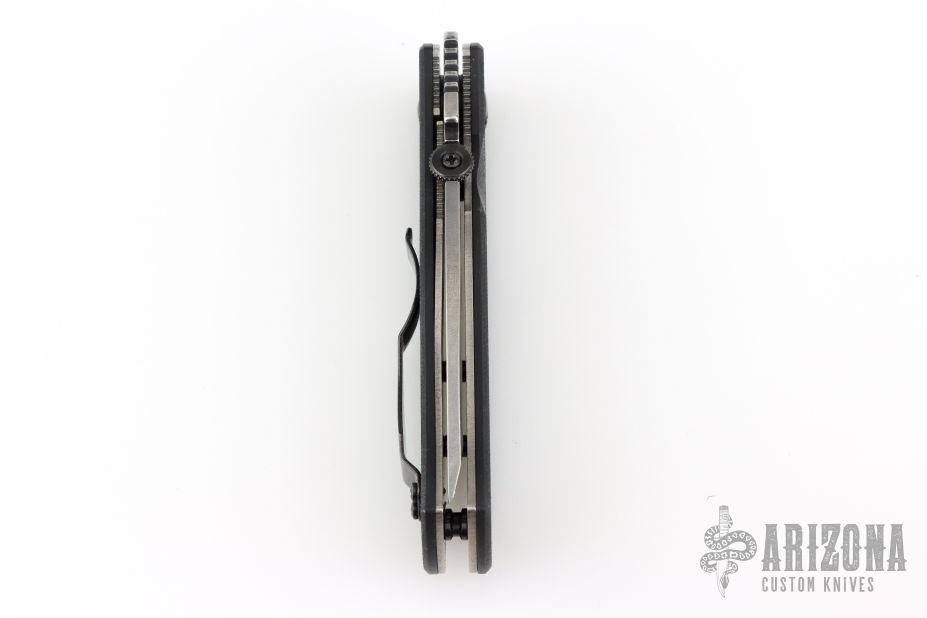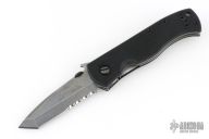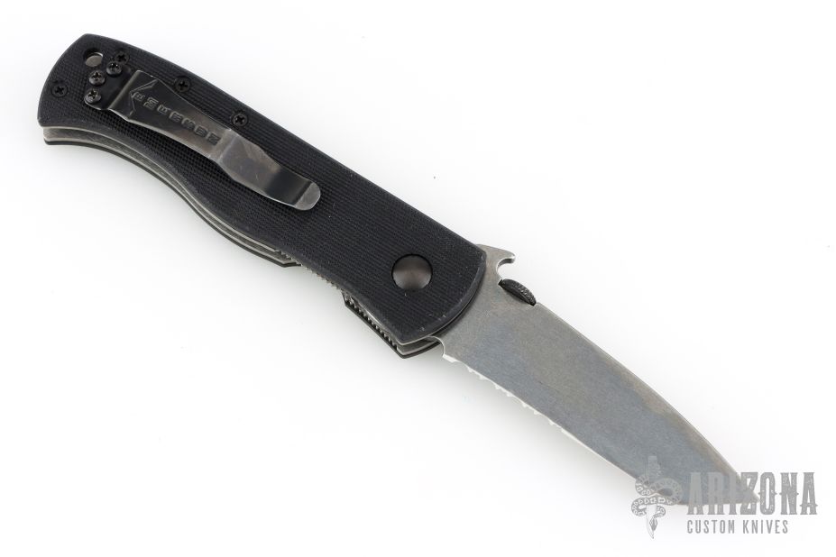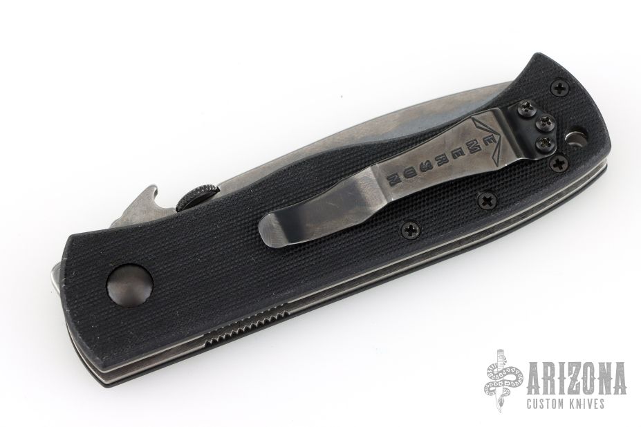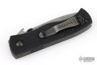This CQC-7 from Emerson features a thunderstorm finished chisel ground tanto partially serrated blade with notched thumbrest, thumb disc and wave feature. The handle has black G-10 scales, titanium liners, black G-10 standoffs, and a tip up black stainless steel clip. Nice detent, lockup and blade seating. Comes in a nylon belt sheath. Tapped for left handed carry as well. Excellent condition. #0807. Comes with an additional black stainless steel clip with paisley laser engraving.