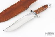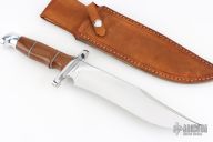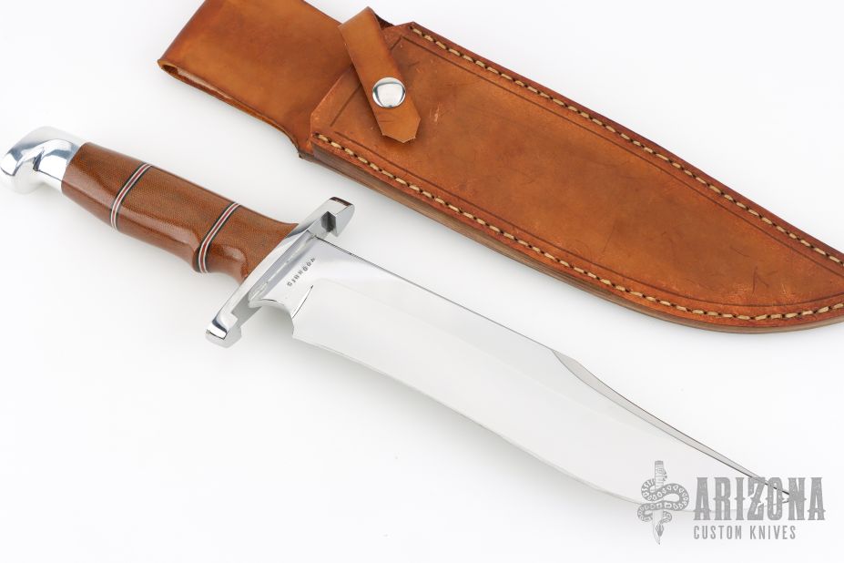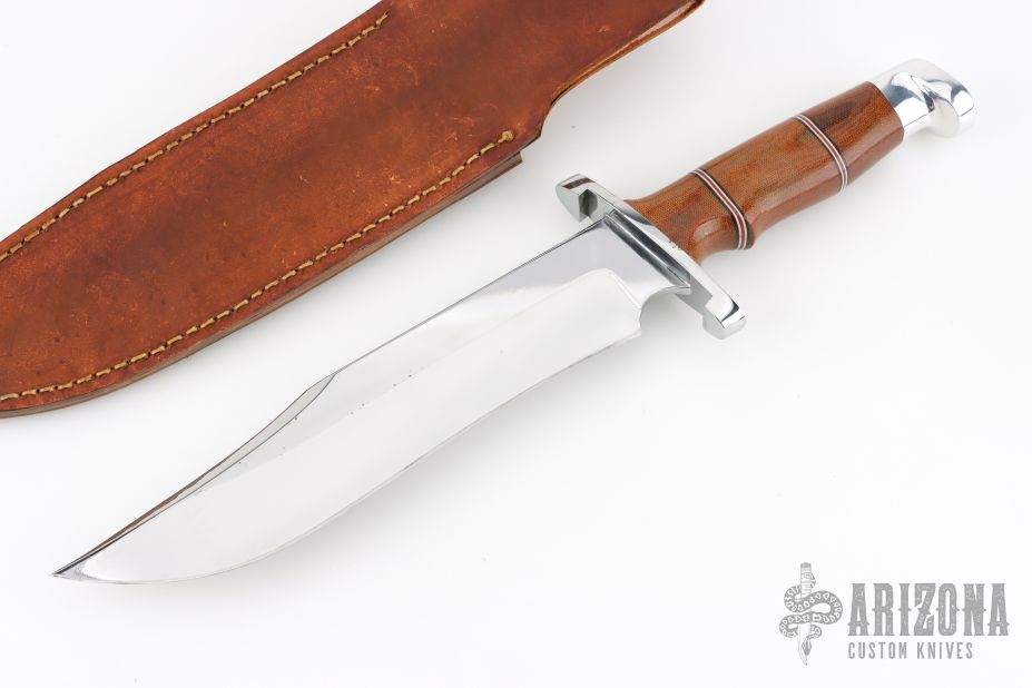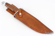 This Bowie by Steve Voorhis features a high polish clip point blade with false top edge, .210" blade stock and 1.90" blade depth, hidden tang construction. The handle has a mirror finished steel guard, red/blue/white spacers, aluminum pommel, and micarta grip. Excellent work. Great fit and finish. Comes with a brown leather sheath. Has some light scratches and oxidation. Excellent condition otherwise.