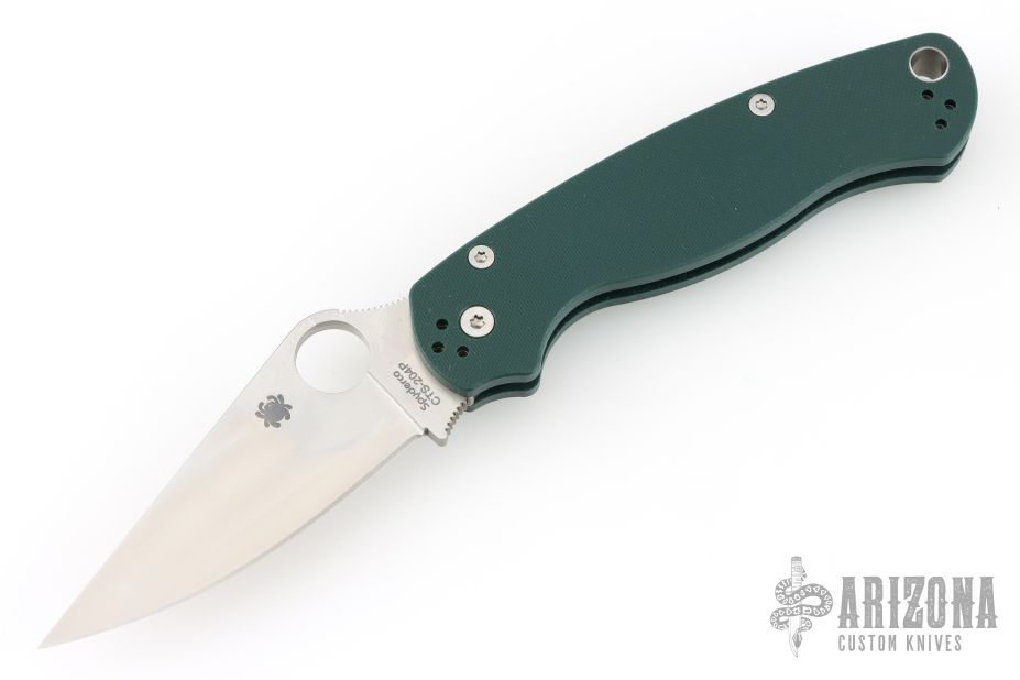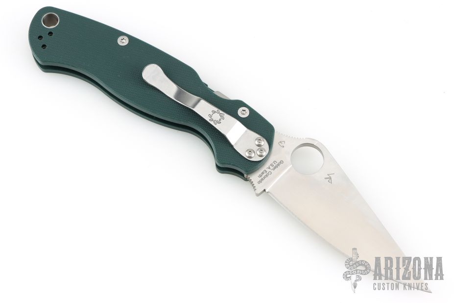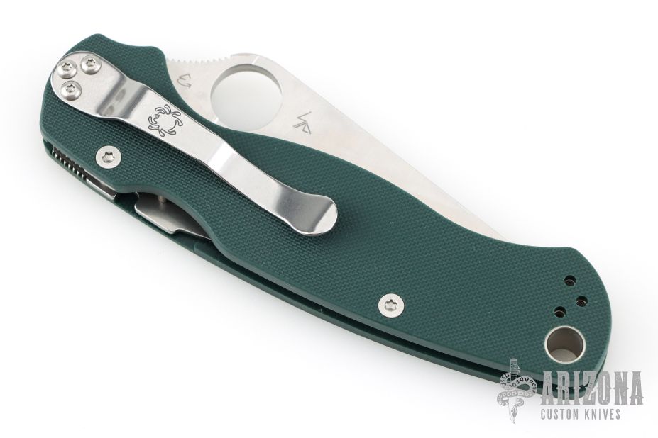 This Paramilitary 2 from Spyderco features a drop point satin finish blade with Spyderco thumb hole and notched thumb ramp and choil. The handle has green G10 scales with stainless steel liners and 4 way adjustable pocket clip with lanyard tube on pommel. Includes the the original box.  Excellent Condition.