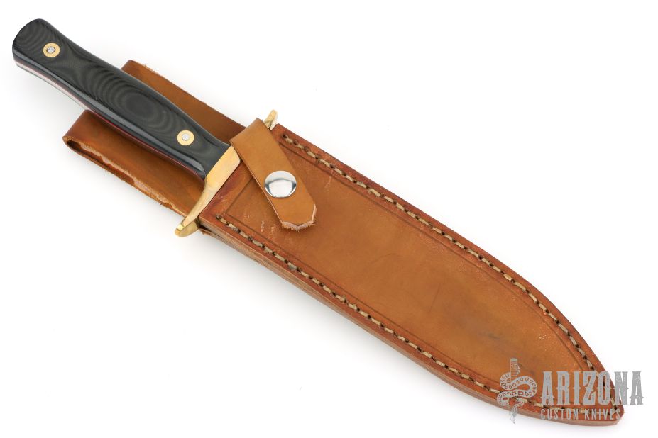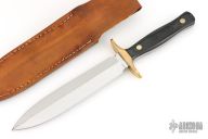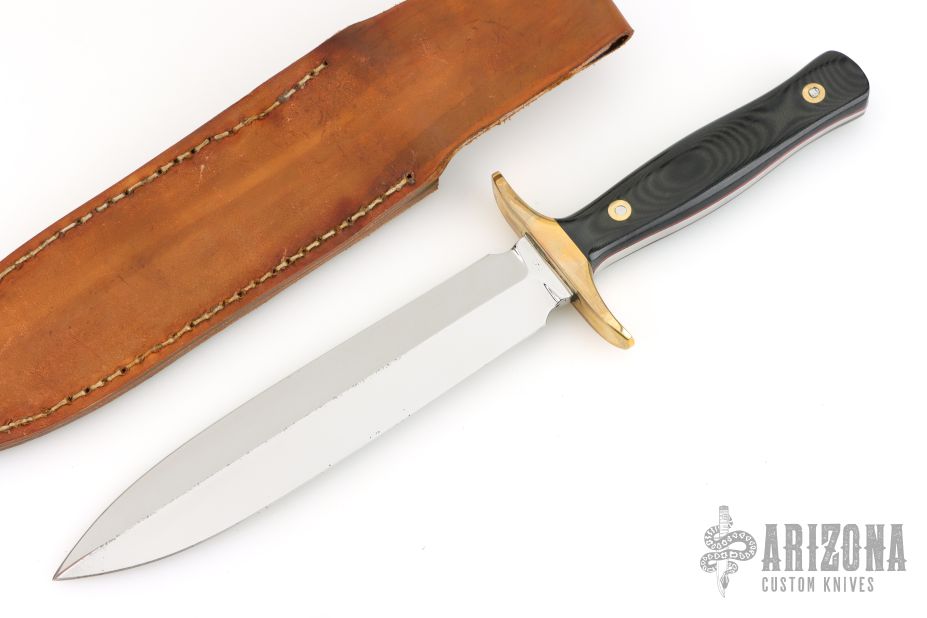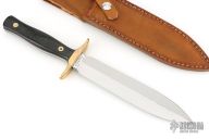 This Dagger from Steve Voorhis features a mirror polished double edged blade with .234" blade stock and 1.33" blade depth, full tang construction. The handle is comprised of a brass guard, micarta covers and red liners. Comes with a leather sheath. Has a couple light scratches, excellent condition.