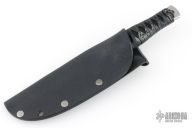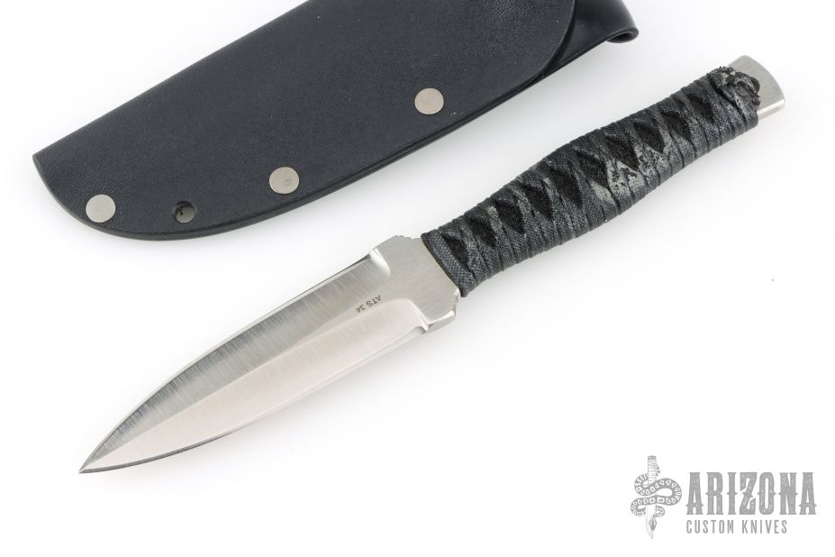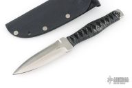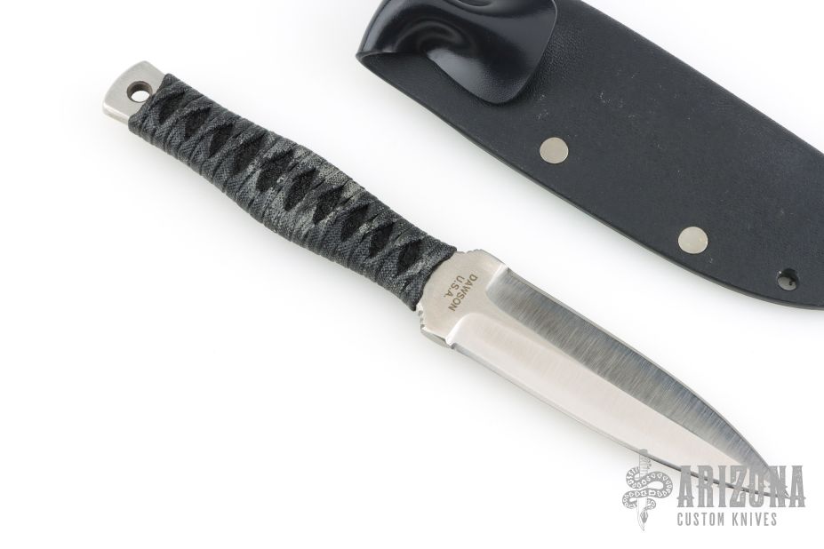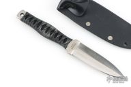 This Dagger by Barry Dawson features a satin finished double edged blade with notched thumbrest, .168" blade stock and 1.036" Blade depth, full tang construction with epoxied cord wrapped handle. Comes with a kydex sheath. Excellent condition.