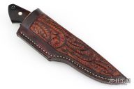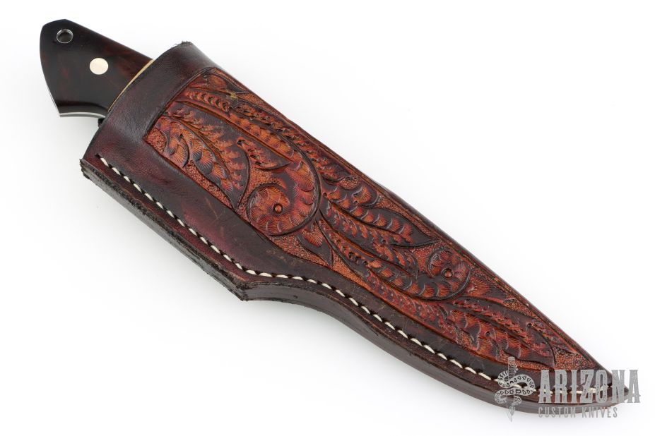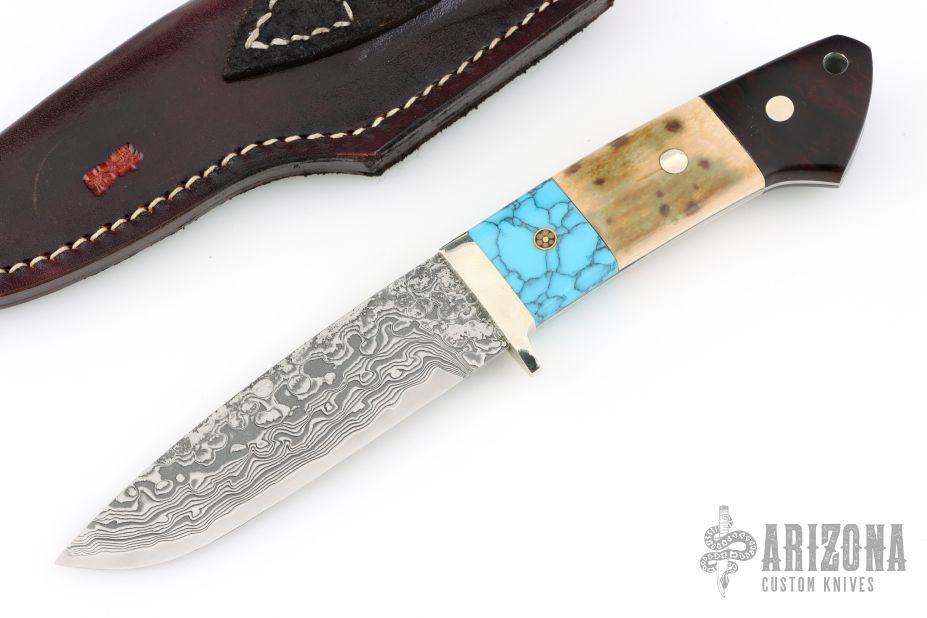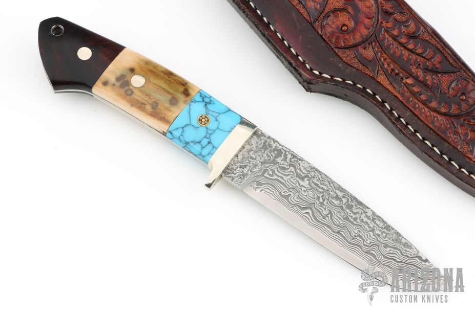 This Drop point Hunter features a drop point R2 San Mai Damascus blade, .132" blade stock and 1.235" blade depth, full tapered tang construction. The handle has a nickel silver guard, hand contoured turquoise, mammoth ivory and desert ironwood scales, mosaic and nickel silver pins and lanyard hole. Comes with hand tooled brown leather sheath with belt loop. Comes with a zippered case. Excellent condition.