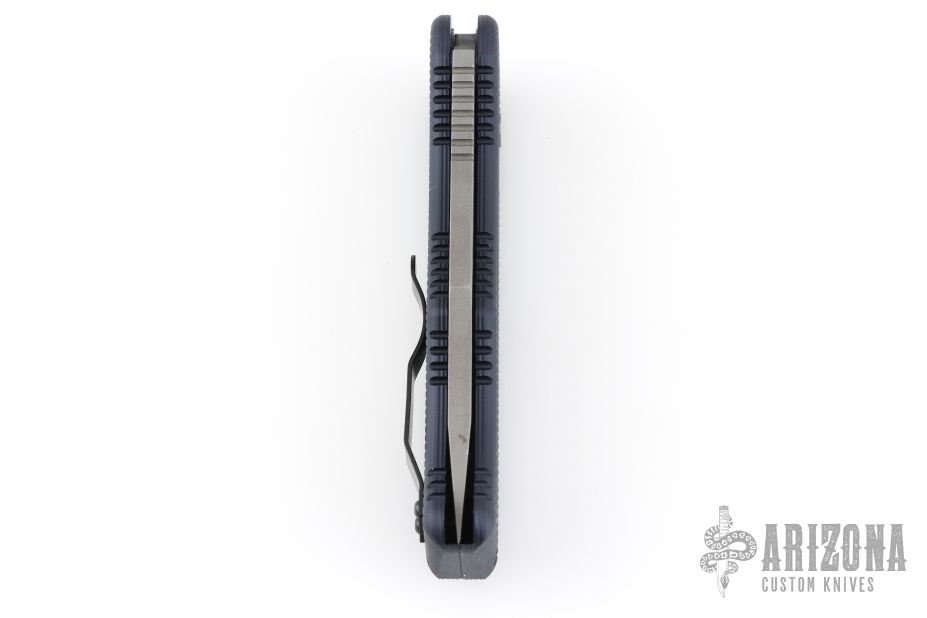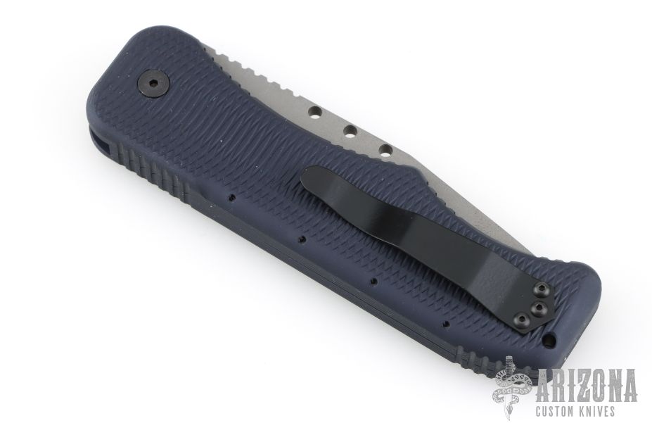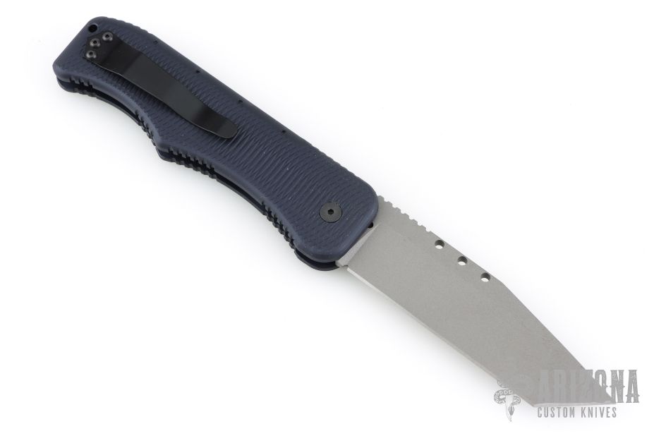 Very hard to find automatic with bead blast finished tanto blade and textured aluminum handle. Strong, quick action. Tip up carry clip. Has some light scuffs and scratches, excellent condition otherwise.
