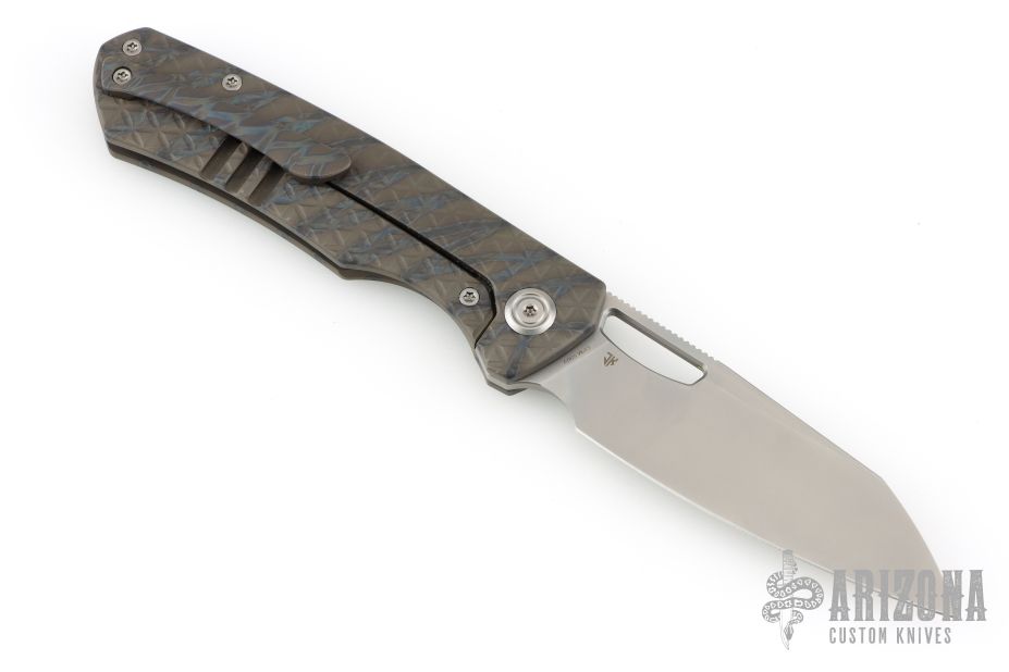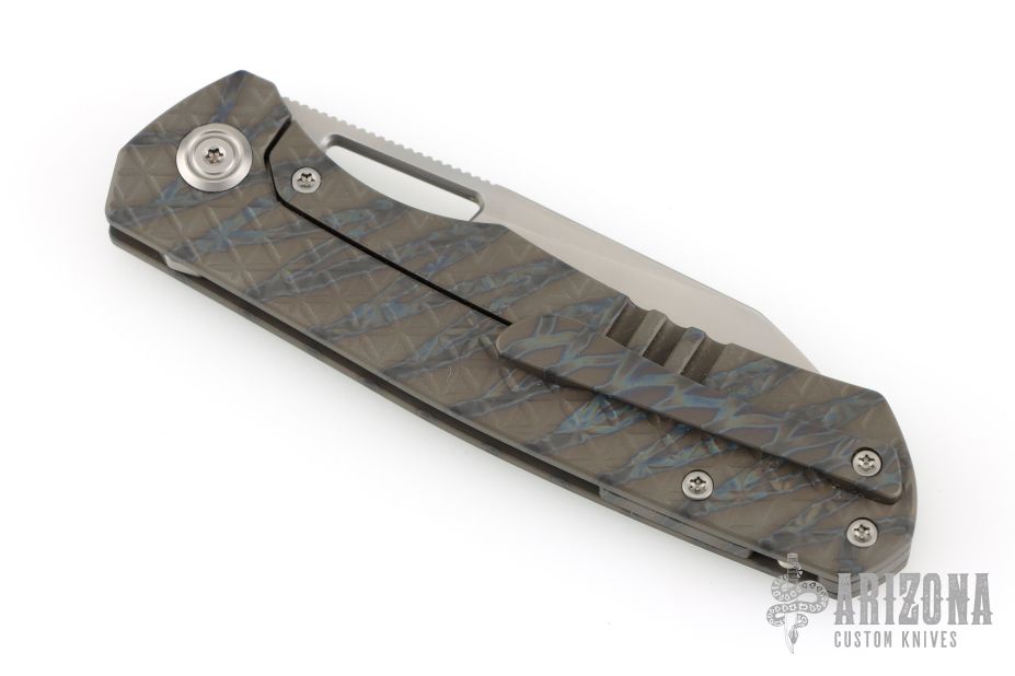 Designed by Johnathan Jacobs, this knife features an 8.1" overall length with a 3.5" S90V tanto blade finished in beadblast and hardened to 60–62 HRC for excellent edge retention and durability. The titanium handle with triangle milling provides a secure grip, while the frame lock and tip-up pocket clip ensure reliable everyday carry. Weighing just 3.7 oz, it offers a lightweight yet robust build suited for precision performance.  Comes with original box and papers. Excellent condition.