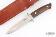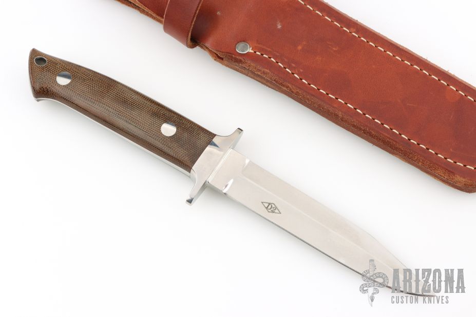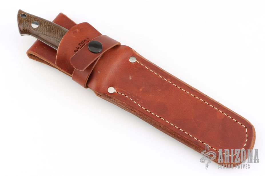 This fighter by Bob Dozier features a hand ground mirror finished blade with a false top edge, .185" blade stock and .924" blade depth, full tapered tang construction. This knife was hand ground and made solely by Bob Dozier. The handle has a stainless steel guard, green canvas micarta scales. Has lanyard hole at the butt. Comes with a brown leather sheath. Has a few light scratches, Excellent condition.