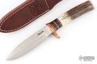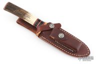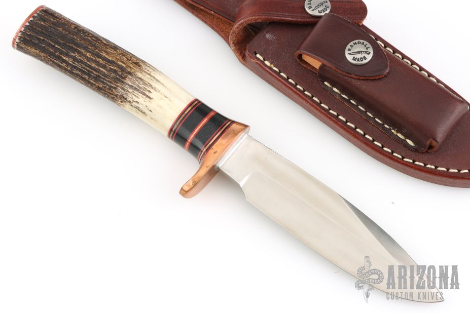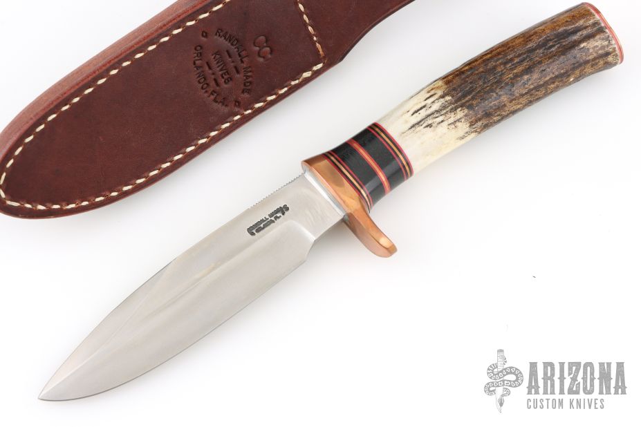 This Copper Companion by Randall Made Knives features a stainless steel blade, .144" blade stock, 1.146" blade depth. 1.5" sharpened top edge and notched thumbrest, hidden tang construction. The handle has a copper guard and butt plate, stag grip and red/black/copper/black linen micarta spacer pattern. Comes with brown leather sheath. Some patina on the copper. Excellent condition.