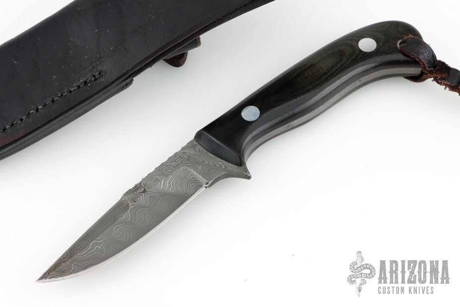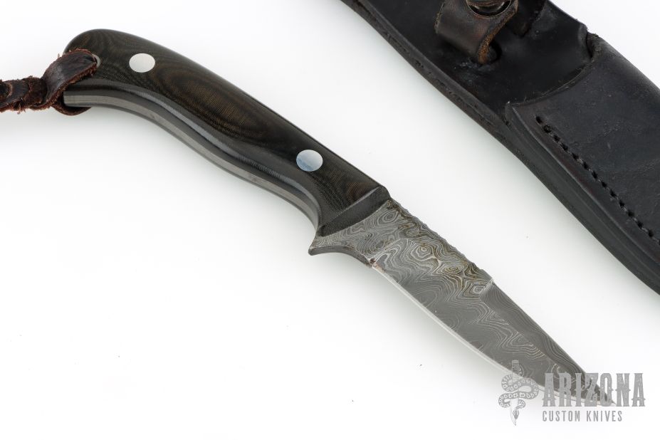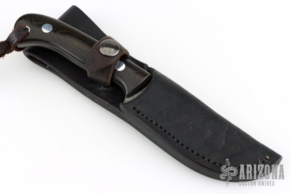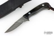 This custom knife by Keith Murr features a Damascus spear point blade with top edge, fileworked thumbrest, .152" blade stock, .89" blade depth, full tang construction. The handle has black/green linen micarta scales with aluminum pins. Great feel in the hand. Very nice work. Includes a brown leather sheath. Has some light scuffs and patina/oxidation. Excellent condition otherwise.