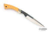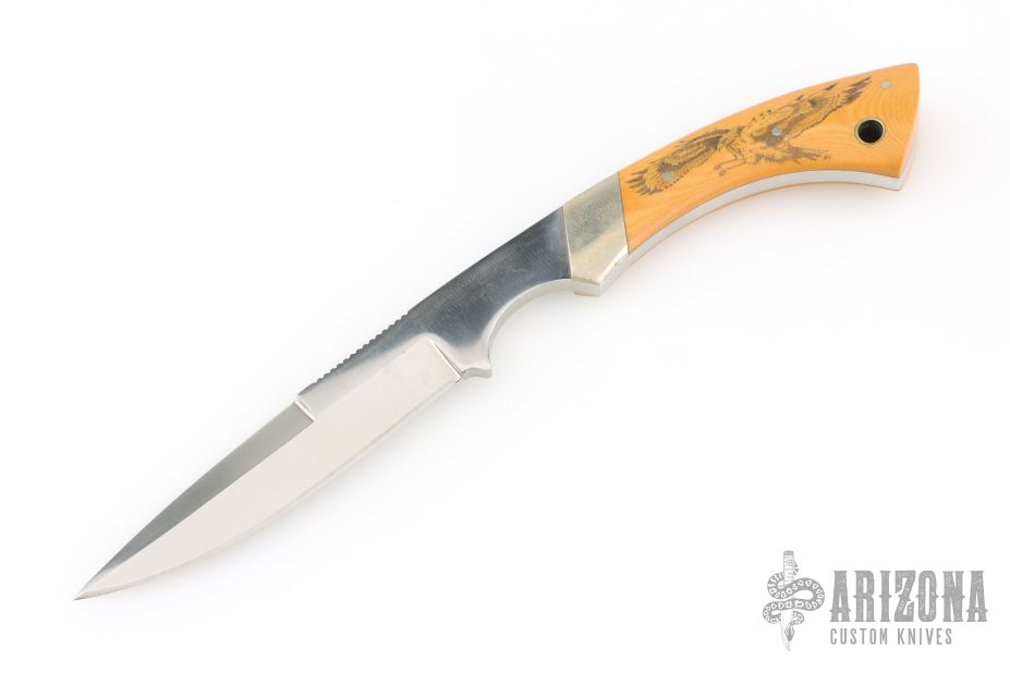 This Weehawk Boot Knife by Pacific Cutlery features a satin finished blade with a false top edge and notched thumbrest, .177" blade thickness and .759" blade depth, full tang construction. The handle has nickel silver bolsters and scrimshaw vintage paper micarta scales with nickel silver pins. Great feel in the hand. Classic Samson design. Has a few light scratches, and a light patina. Excellent condition otherwise.