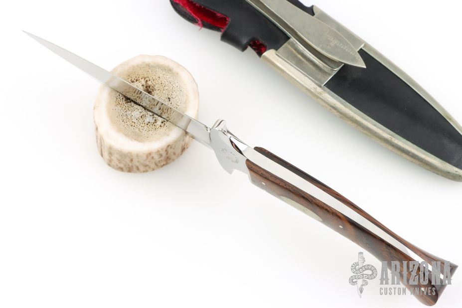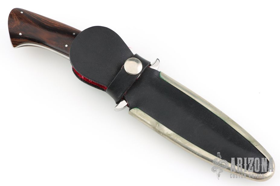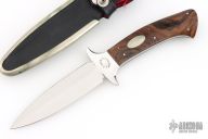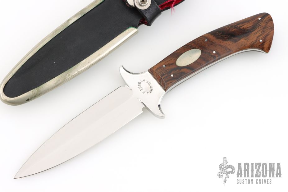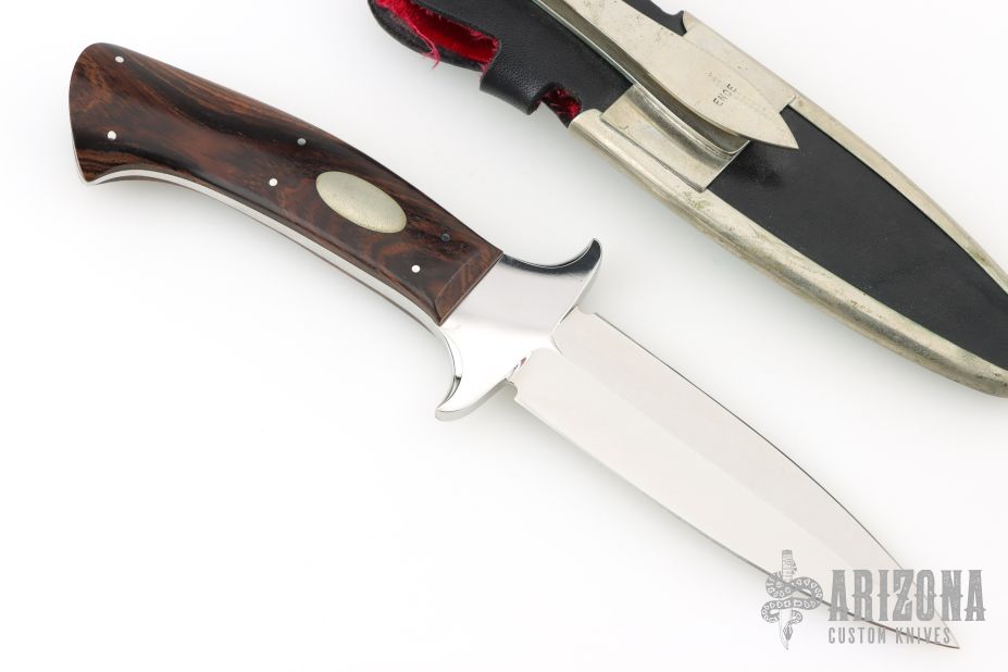 This Dagger by Jim Ence features a mirror polished double edged blade with a full tapered tang. .198" Blade stock. 1.21" Blade Depth. The handle features wood scales with nickel silver escutcheon and pins. Includes a black leather boot sheath. Has a couple light scratches, Excellent Condition.