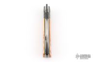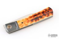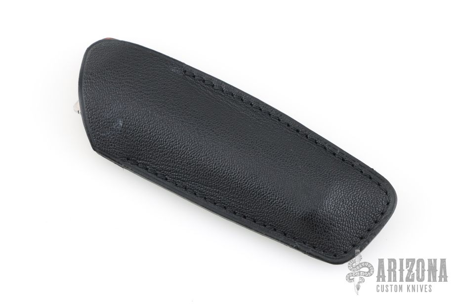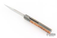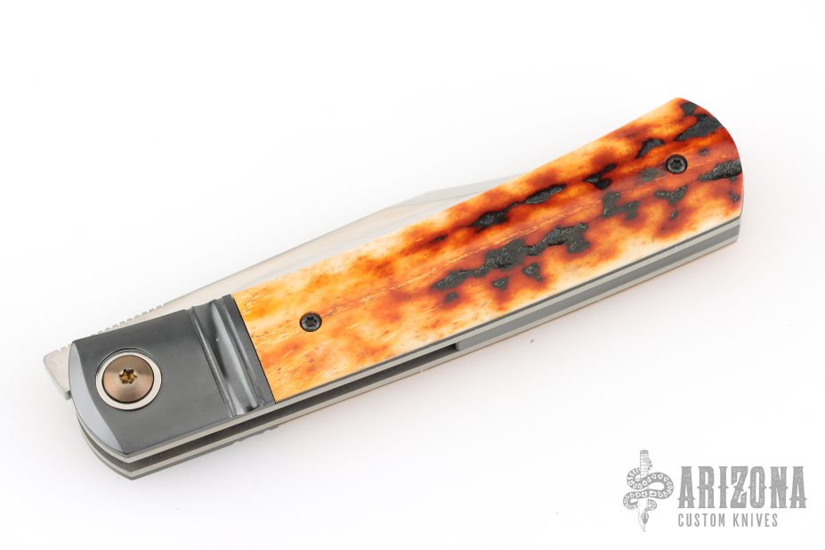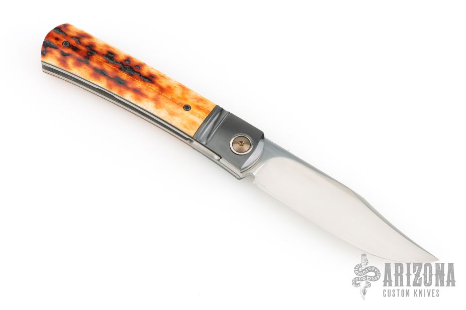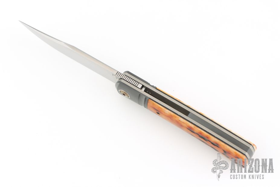 This Clip Point Front Flipper by Maxime Belzunce features a hand rub satin finished blade with notched thumbrest and front flipper. The handle has fluted zirconium bolsters, jigged bone scales, bead blasted titanium and black liners, and Zirconium backspacer. Nice detent, lockup and blade seating. Comes with a leather slip sheath and makers card. New from maker at the 2025 Blade Show Texas!