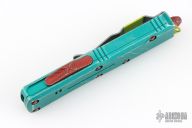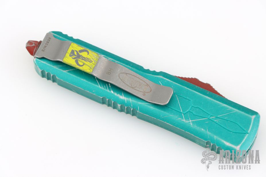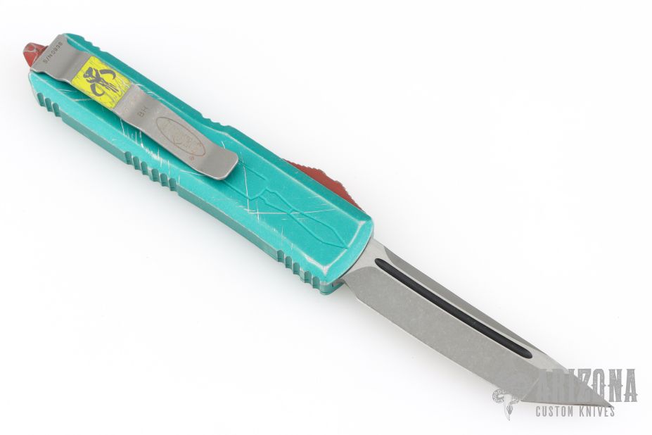 This UTX-85 Bounty Hunter by Microtech features a tanto blade with fullers, satin flats and apocalyptic finished grinds. The handle has a green battle worn aluminum handle with red hardware, tip down apocalyptic finished stainless steel clip. Comes with original box and papers. Excellent condition. S/N 0936 and dated 09/2020.