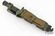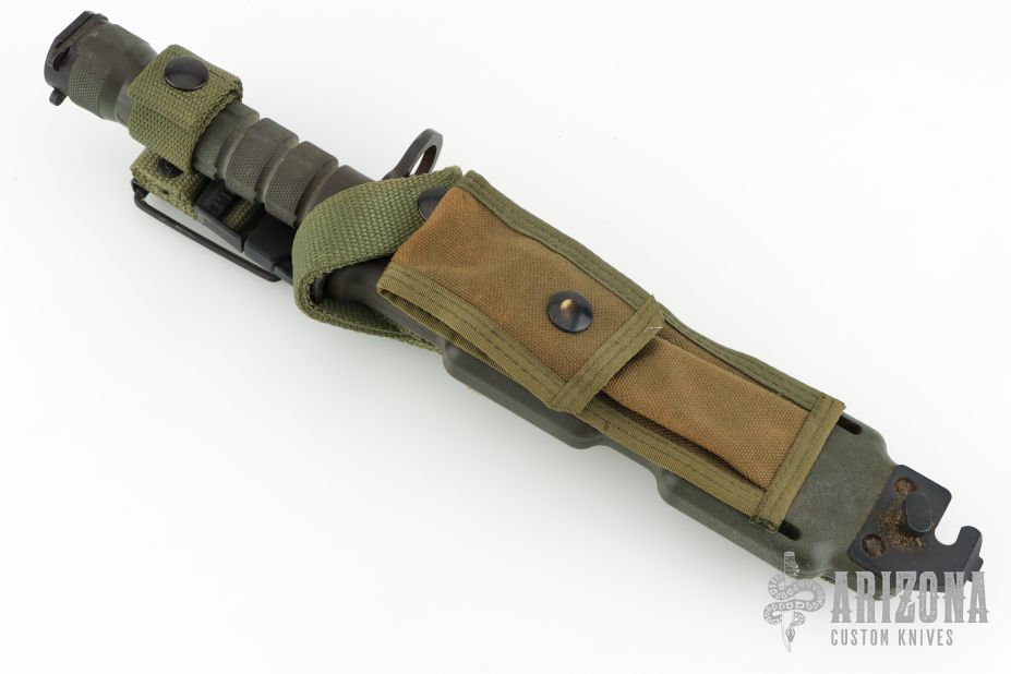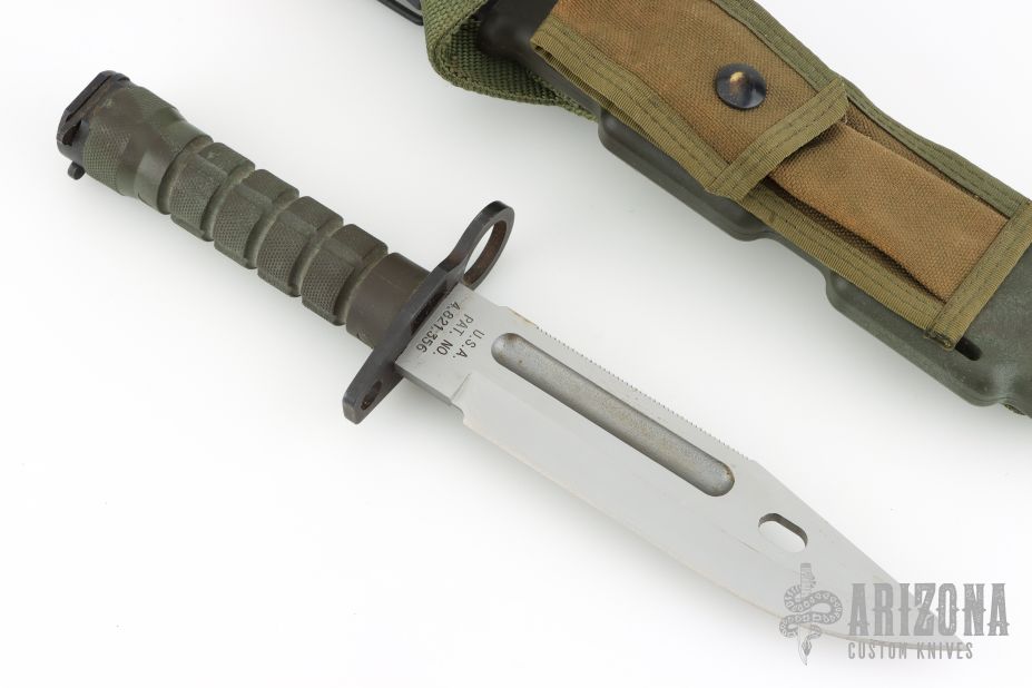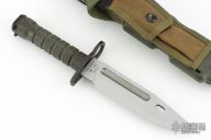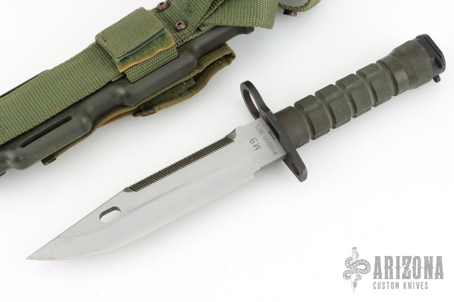 This M9A1 Phrobis Int'l features a bead blasted spear point blade with sawteeth on the spine and a large fuller, .235" blade stock and 1.453" blade depth, hidden tang construction. The handle has a black steel guard and green plastic grip and can be removed from the handle for cleaning. Comes with original green sheath. Has some sheath marks and light scuffs, otherwise excellent condition.