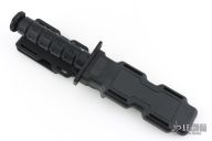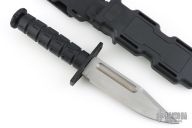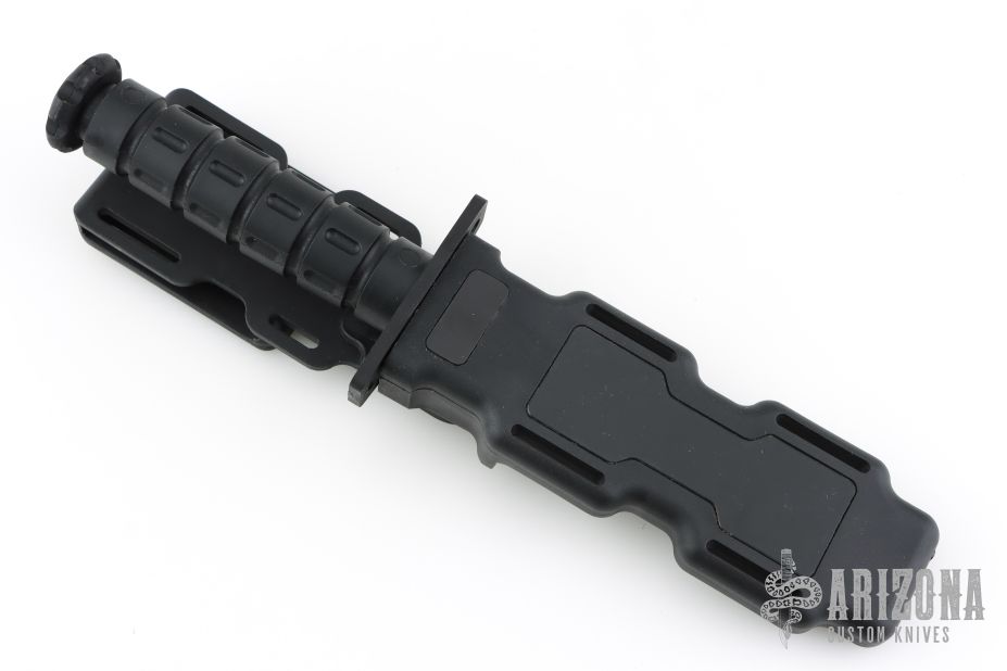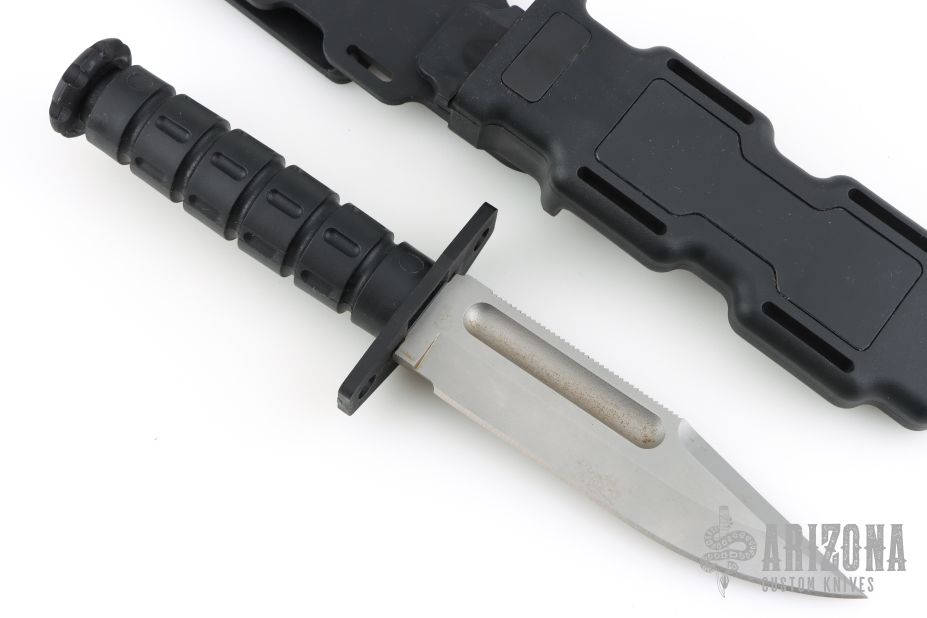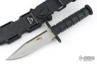 This MFK by Phrobis features a bead blasted blade with sawteeth on the spine and a large fuller, .206" blade stock and 1.293" blade depth, hidden tang construction. The handle has a black zytel guard and black zytel grip. Comes with original black zytel sheath. Has some light oxidation on the blade, otherwise unused condition. Comes with original box, papers and extra guards.