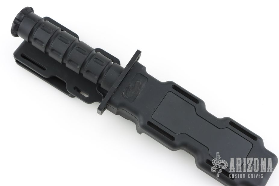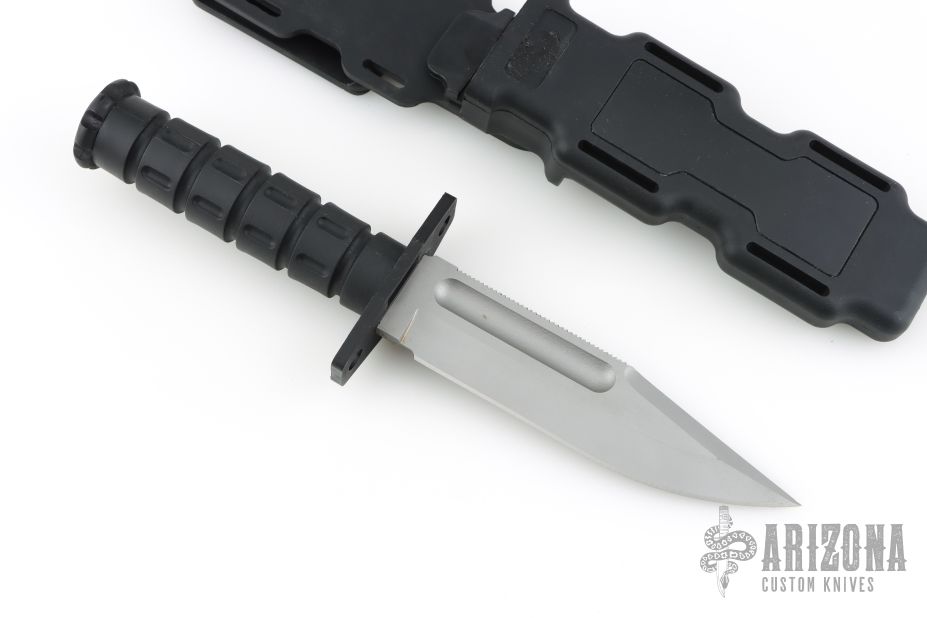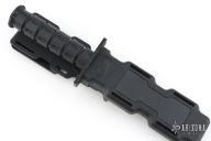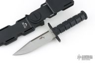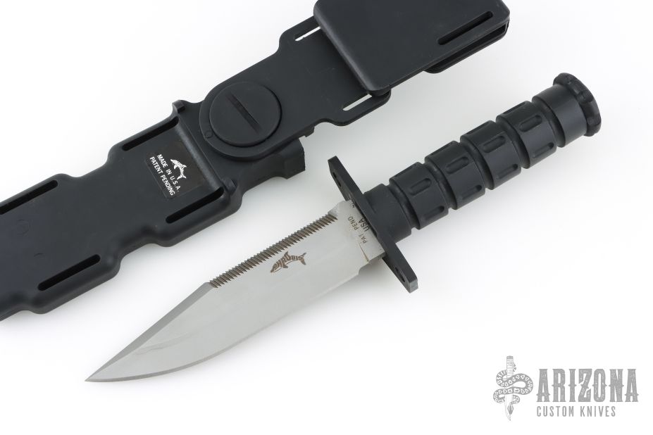 This MFK by Phrobis features a bead blasted blade with sawteeth on the spine and a large fuller, .206" blade stock and 1.293" blade depth, hidden tang construction. The handle has a black zytel guard and black zytel grip. Comes with original black zytel sheath. Excellent condition. Comes with original box and extra guards.