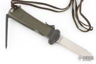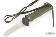 This German Army Paratrooper Knife from Bund features a spear point satin finish gravity blade. The handle is comprised of a steel guard and lever with OD Green plastic scales over metal frame. D Ring lanyard bail and lanyard on pommel. Knife also features a steel C4 punch/Marlin spike that deploys to the rear of the knife. Comes in a box. Has some light scuffs and scratches, excellent condition otherwise.