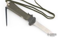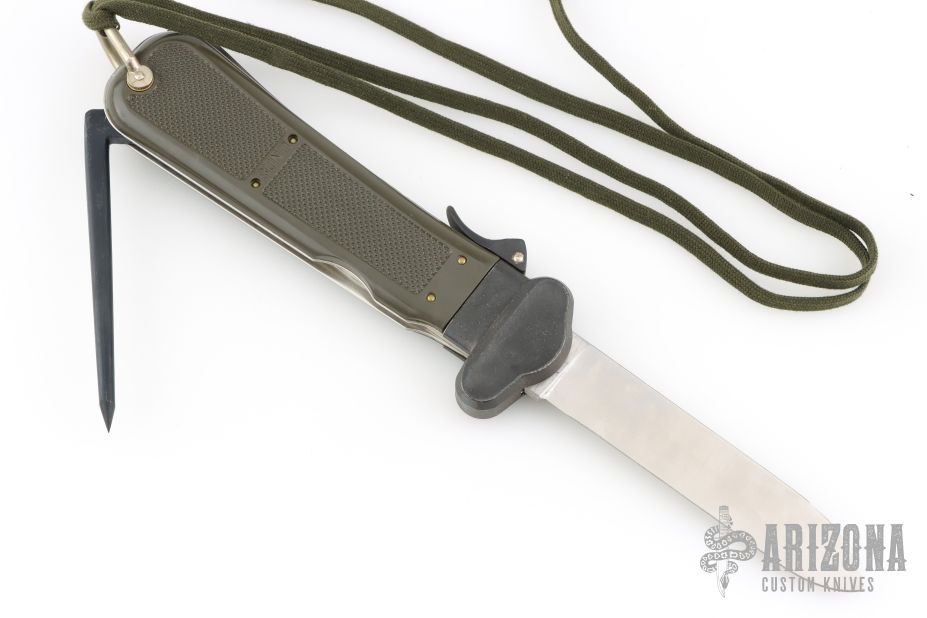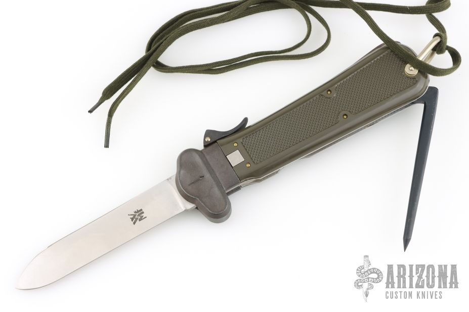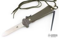 This German Army Paratrooper Knife from Bund features a spear point satin finish gravity blade. The handle is comprised of a steel guard and lever with OD Green plastic scales over metal frame. D Ring lanyard bail and lanyard on pommel. Knife also features a steel C4 punch/Marlin spike that deploys to the rear of the knife. Comes in original box. Excellent condition. New old stock