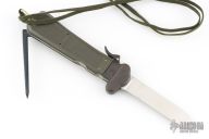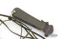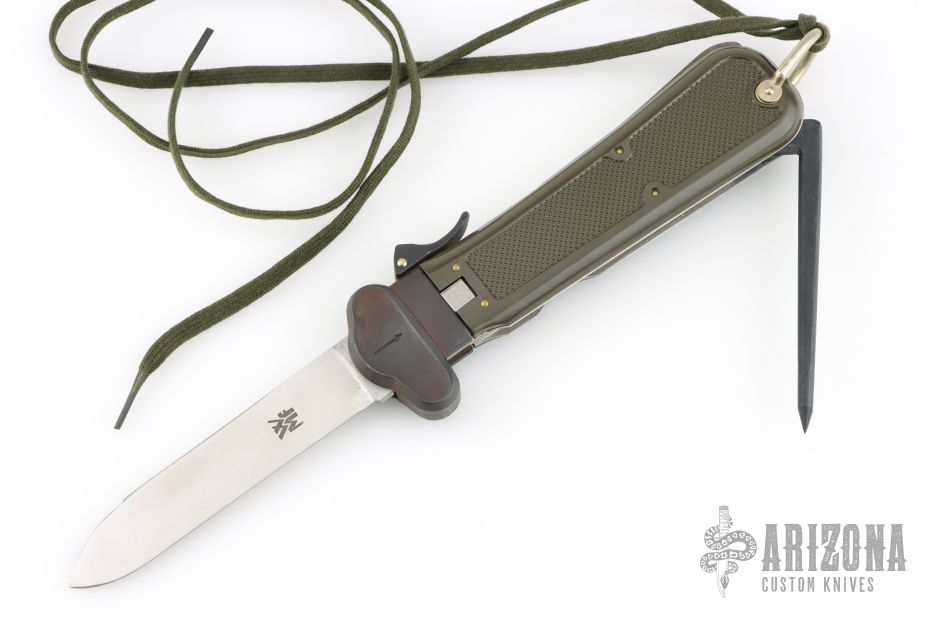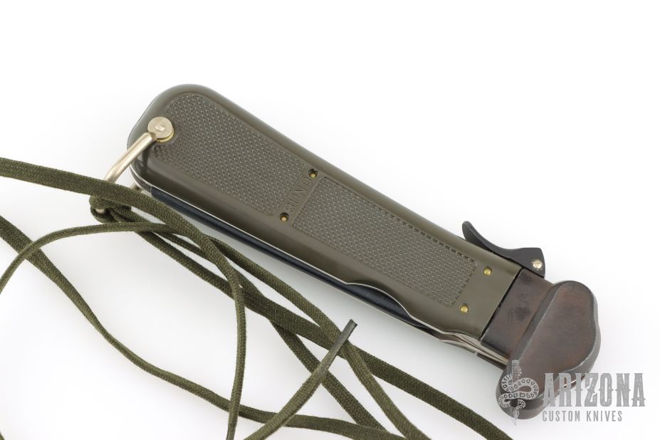 This German Army Paratrooper Knife from Bund features a spear point satin finish gravity blade. The handle is comprised of a steel guard and lever with OD Green plastic scales over metal frame. D Ring lanyard bail and lanyard on pommel. Knife also features a steel C4 punch/Marlin spike that deploys to the rear of the knife. Comes in original box. Excellent condition. New old stock