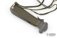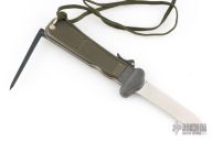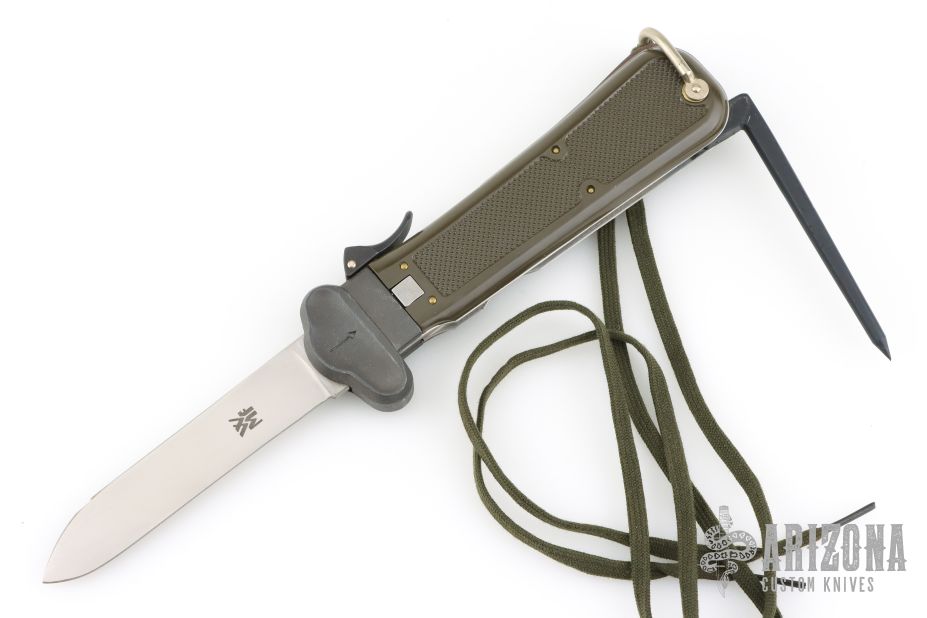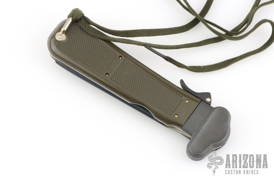 This German Army Paratrooper Knife from Bund features a spear point satin finish gravity blade. The handle is comprised of a steel guard and lever with OD Green plastic scales over metal frame. D Ring lanyard bail and lanyard on pommel. Knife also features a steel C4 punch/Marlin spike that deploys to the rear of the knife. Comes in original box. Excellent condition. New old stock
