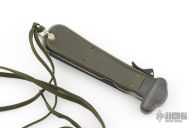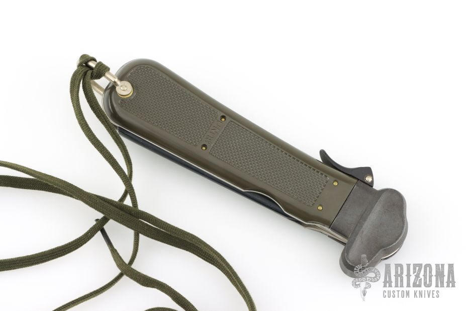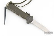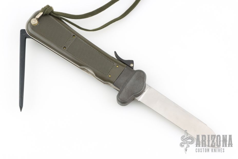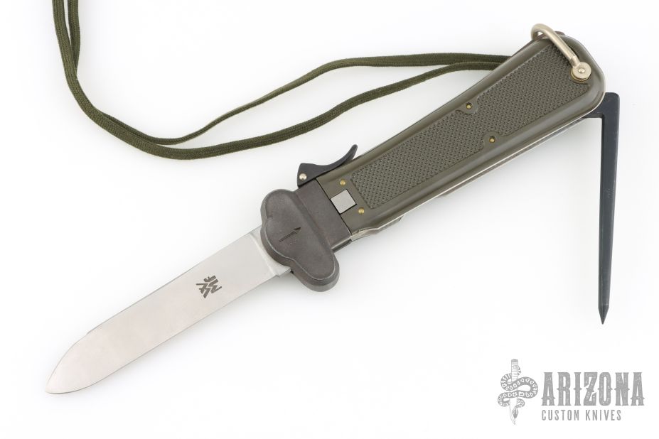 This German Army Paratrooper Knife from Bund features a spear point satin finish gravity blade. The handle is comprised of a steel guard and lever with OD Green plastic scales over metal frame. D Ring lanyard bail and lanyard on pommel. Knife also features a steel C4 punch/Marlin spike that deploys to the rear of the knife. Comes in original box. Excellent condition. New old stock