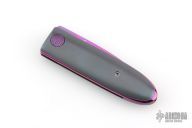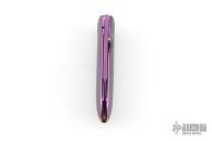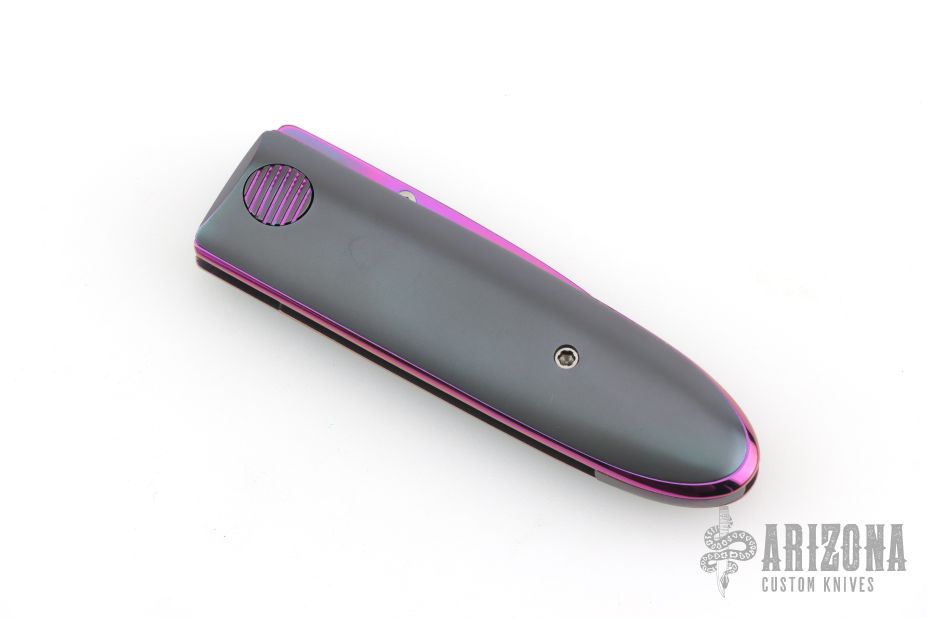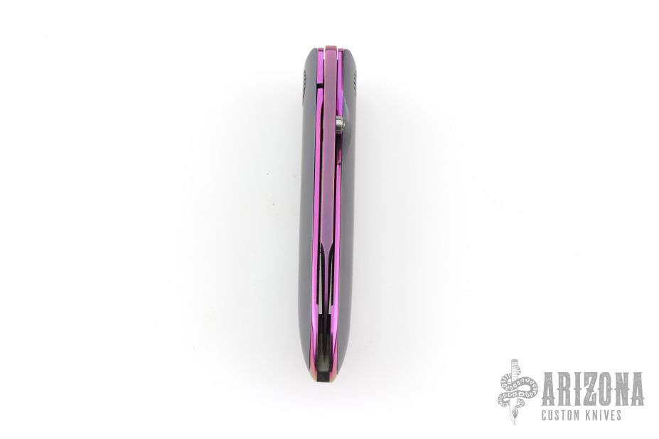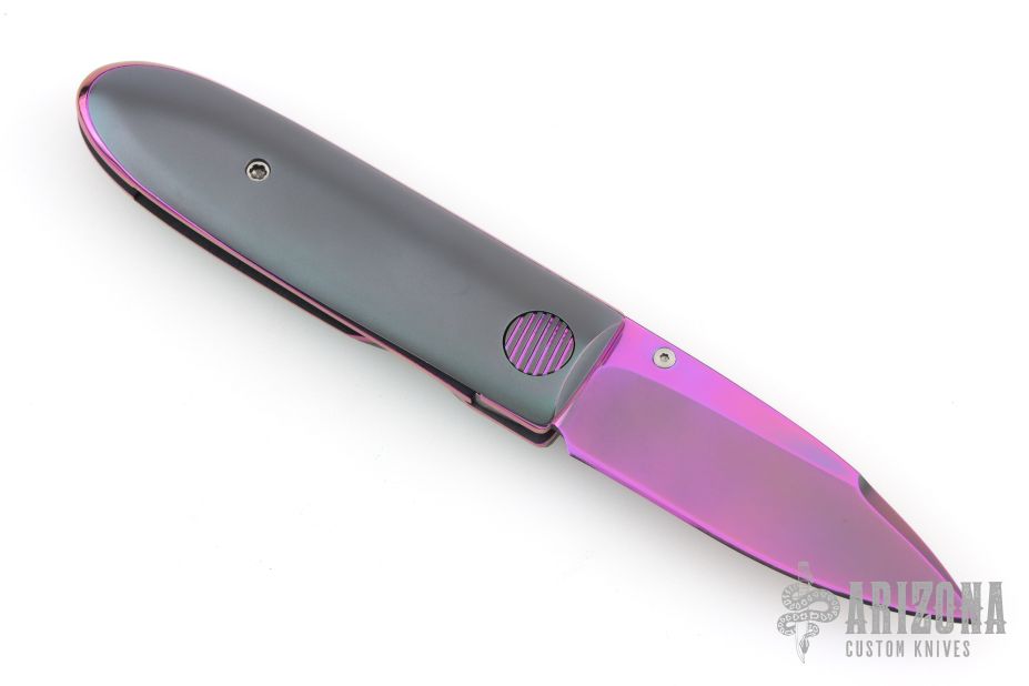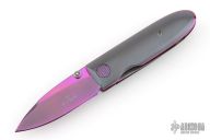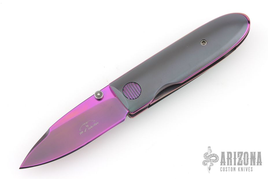 This Linerlock by Michael Walker features a two-tone anodized drop point blade with a single knurled thumbstud. The handle has fine bead blasted titanium scales with anodized titanium liners.  Nice lockup, detent and blade seating. Comes with a padded zippered case. A-Side of the blade is marked "by ML Walker".  Excellent condition.