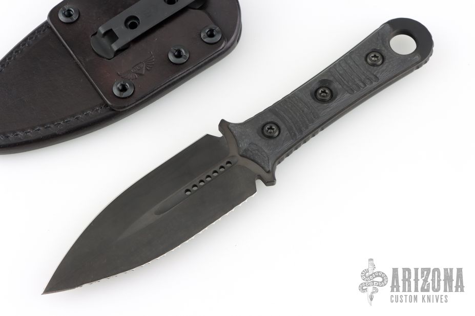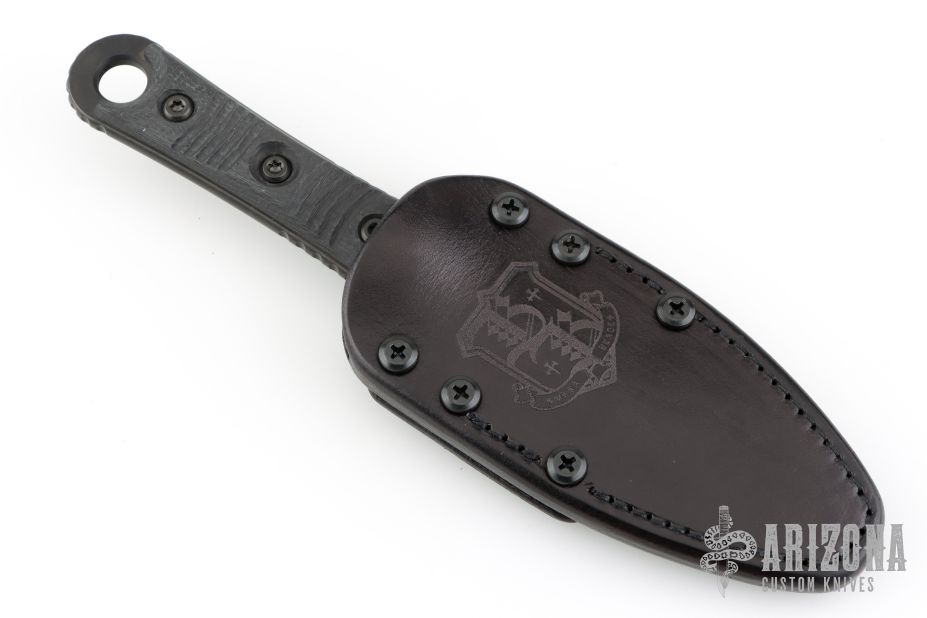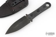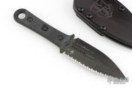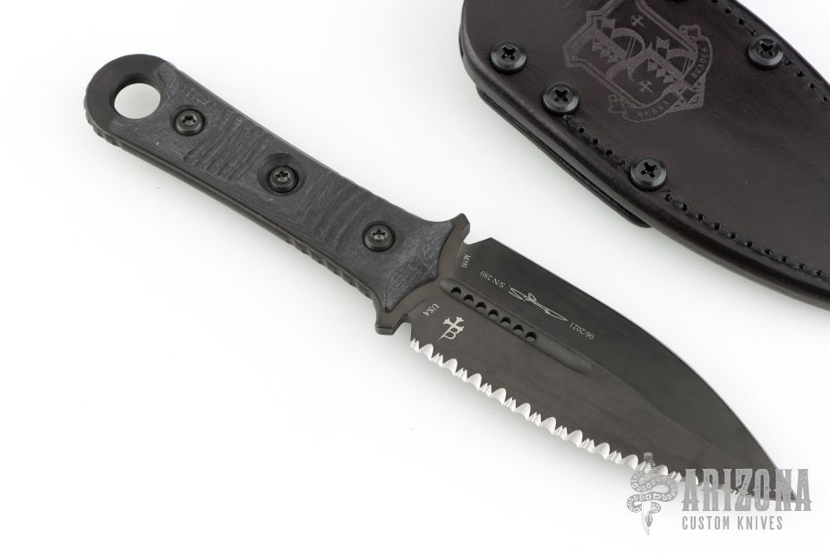This SBD by Microtech Knives and Borka Blades features a DLC finished double-edged blade with a fully serrated edge, .192" blade stock and 1.584" blade depth, full tang construction with carbon fiber scales with DLC hardware. Comes with the original black leather sheath. Dated 06/2021 s/n 280. Excellent condition.