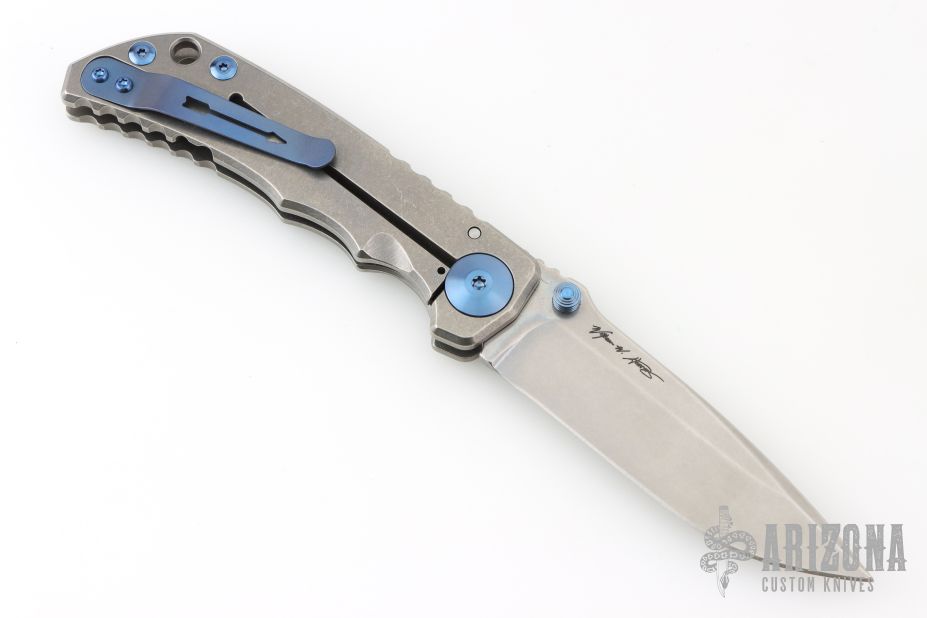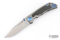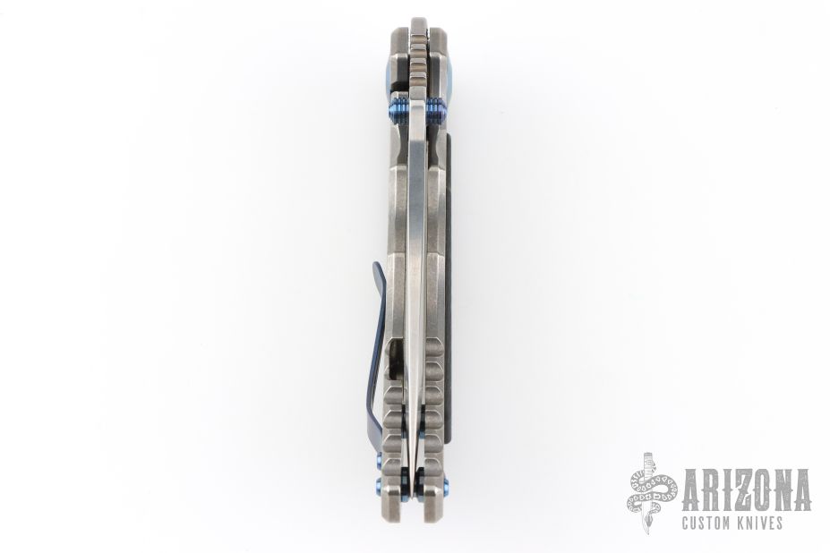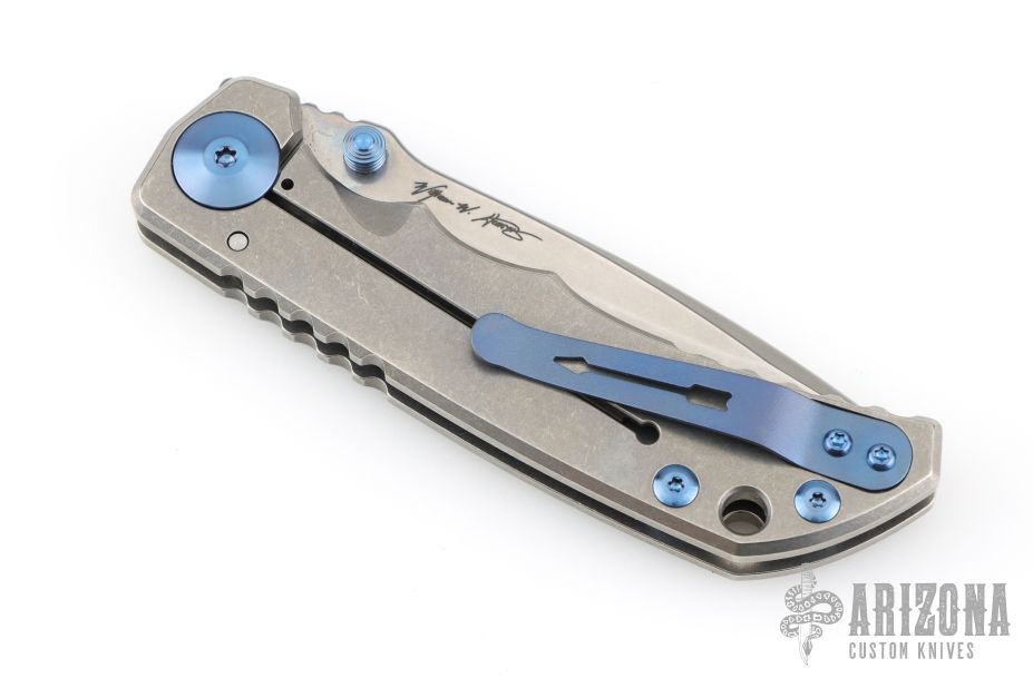 This Harsey Folder by Spartan Blades features a stonewashed blade with dual anodized titanium thumbstuds and notched thumbrest. The handle has a stonewashed titanium frame with carbon fiber inlay, anodized titanium hardware, tip up reversible clip. Comes with original box. Excellent condition.