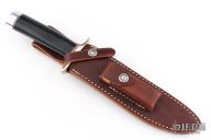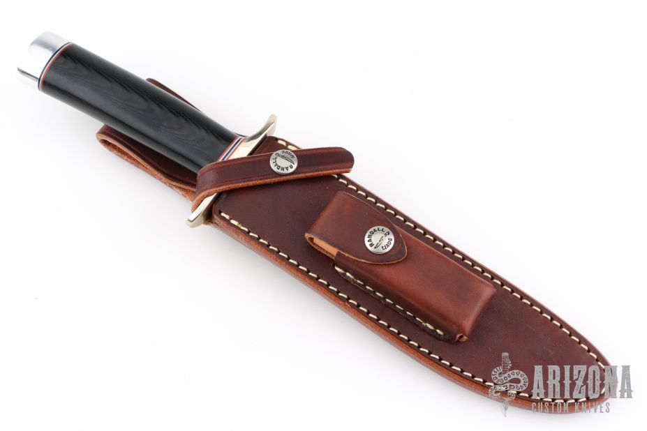 This Model 1-7 from Randall Made Knives features a satin finished clip point blade with sharpened top edge, .220" blade stock and 1.256" blade depth, hidden tang construction. The handle is comprised of a nickel silver guard, red/white/blue spacers, black linen micarta handle and duralumin pommel. Comes with a brown leather sheath and original paper wrapping. Excellent condition.