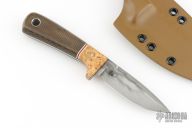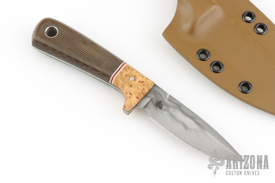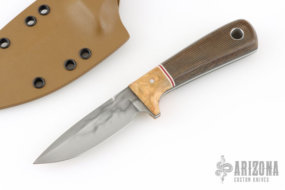 This knife by Bradshaw Blades features a hand rub satin finished blade with nice clay tempered hamon, .113" blade stock and .911" blade depth, full tang construction. The handle has pepperwood burl bolsters, green canvas micarta scales with black G-10 liners and white/red G-10 spacers. Comes with a kydex sheath. Excellent condition.