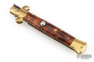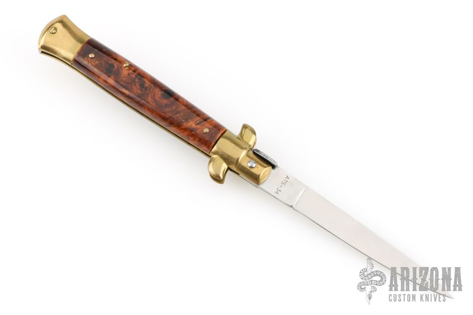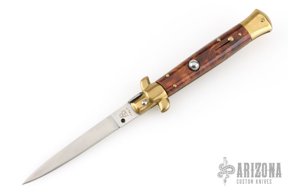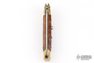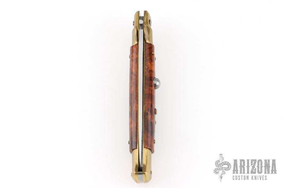 This Swivel Bolster from AB Italy features a satin finished drop point blade. The handle is comprised of brass bolsters and pommel with burl wood scales over brass liners and stainless steel backspacer. Comes in a zipper case. Excellent condition.