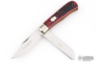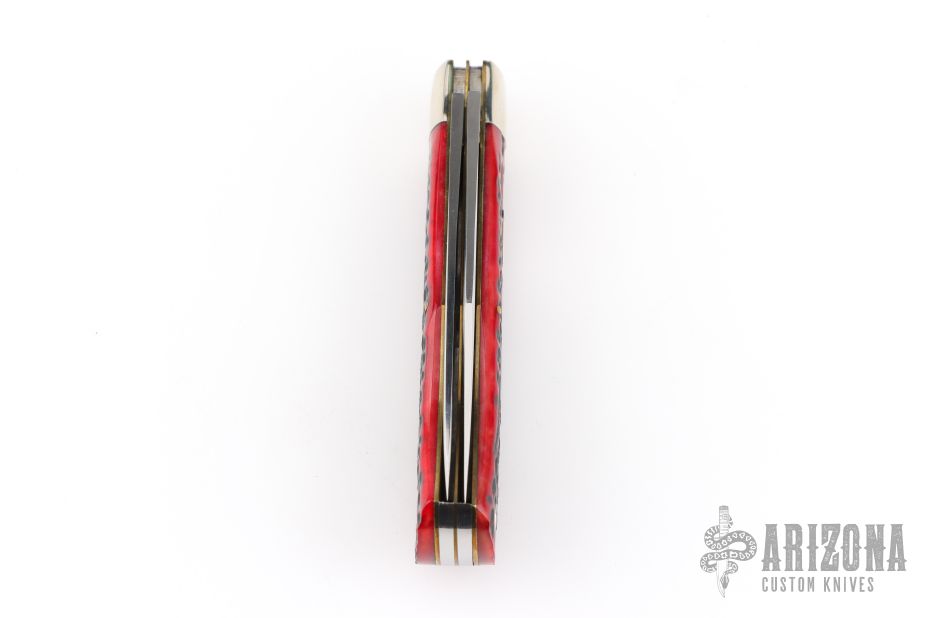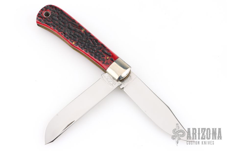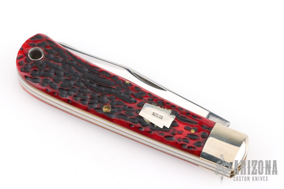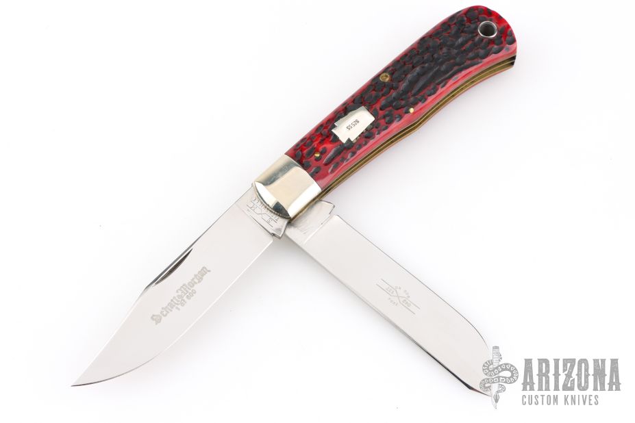 This knife by Schatt & Morgan features mirror polished drop point blades with nail nicks.  The handle has nickel silver bolsters, jigged bone covers with a .925 sterling silver escutcheon, brass liners with steel springs. Comes with original box. Dated 2007. Excellent Condition.  1 of 600 and dated 2004