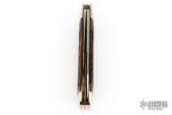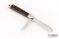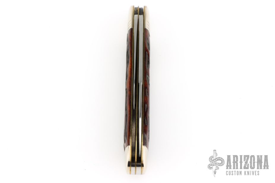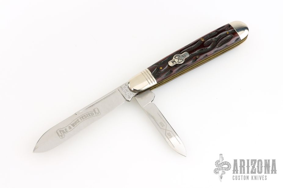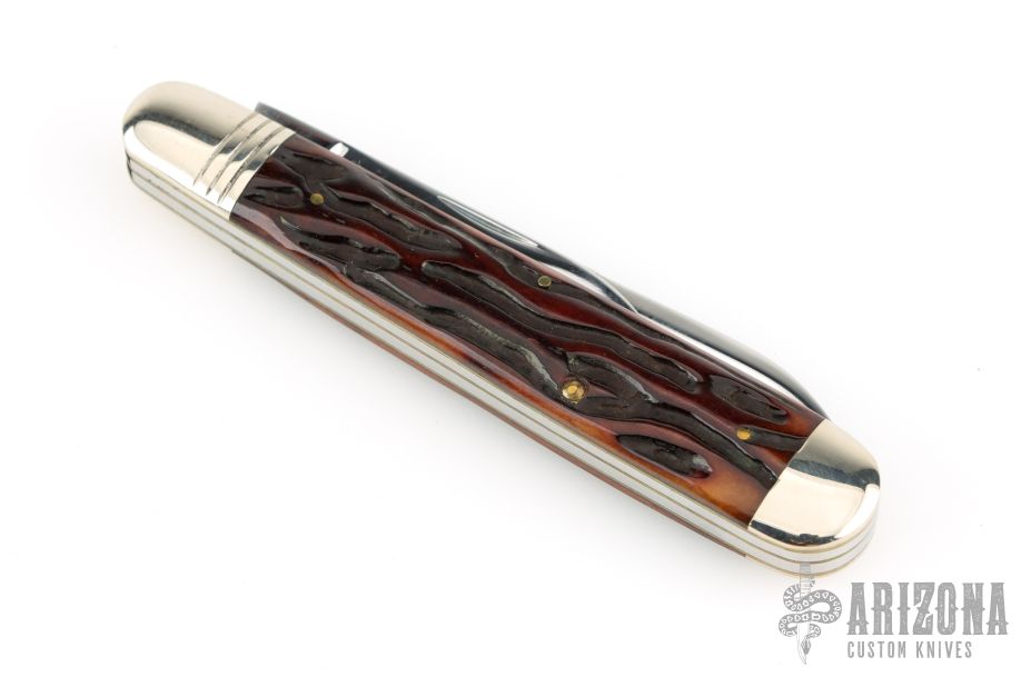 This knife by Schatt & Morgan features 2 mirror polished blades with nail nicks. The handle has nickel silver bolsters, brass liners, jigged bone covers and stainless springs.  Includes the original box. Has a couple light scratches, excellent condition.
