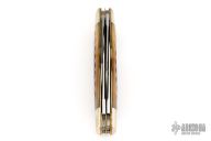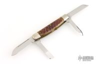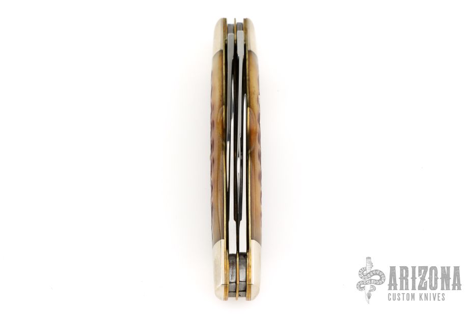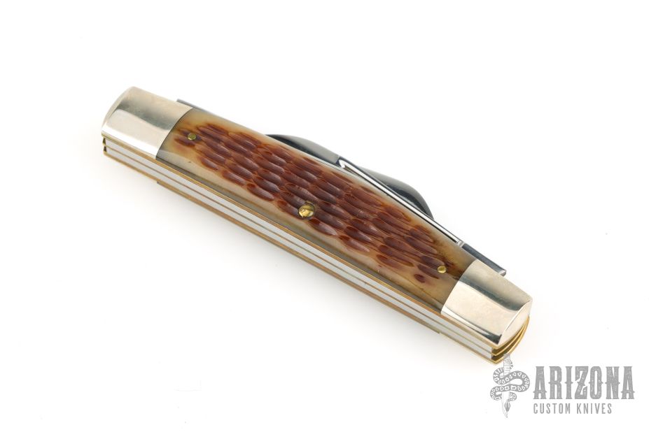 This knife by Schatt & Morgan features mirror polished blades with nail nicks. The handle has nickel silver bolsters, nickel silver shield, brass liners, Bradford green jigged bone covers and stainless springs. Excellent condition. Comes with original box. 1 of 600