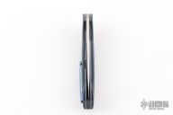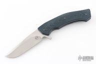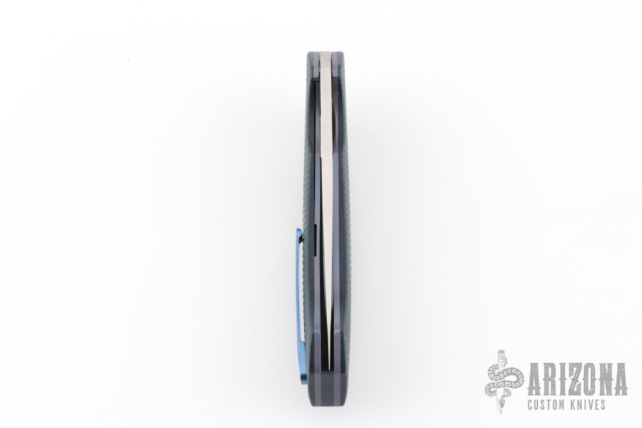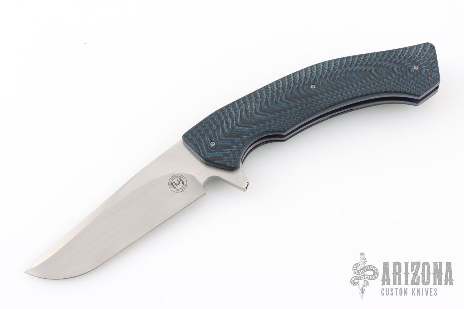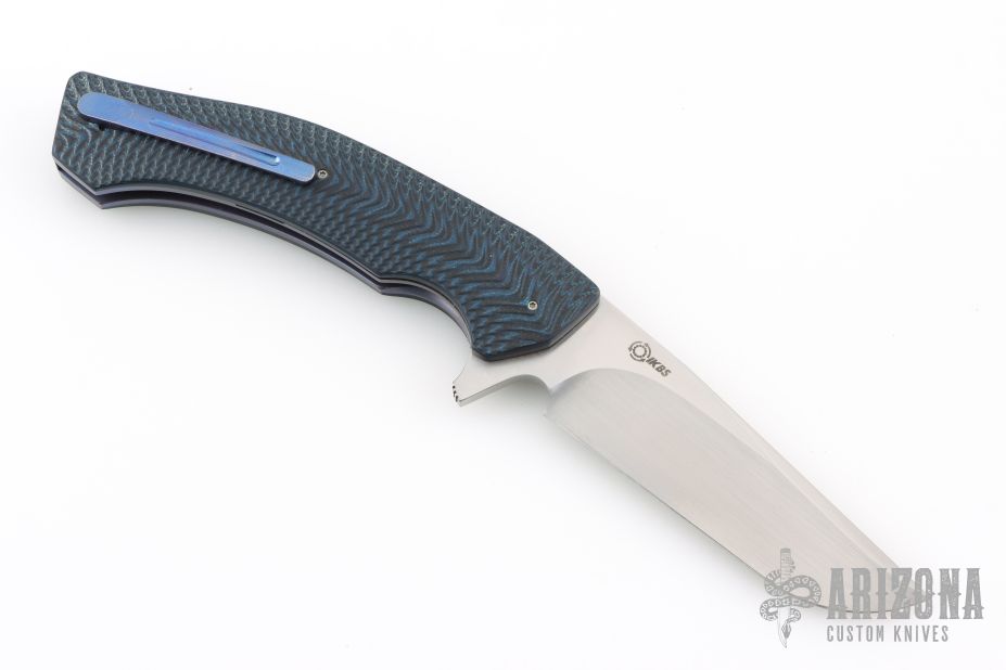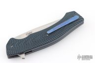 This Model 16 flipper by Andre Van Heerden features a hand rub satin finished blade with notched flipper. The handle has carved black/blue G-10 scales, anodized titanium liners, black G-10 backspacer and an anodized titanium tip up clip. Includes IKBS (Ikoma-Korth Bearing System) for fast and smooth flipper opening that requires no wrist action. Nice blade seating, detent, and lockup. Has a scuff on the clip, otherwise excellent condition.