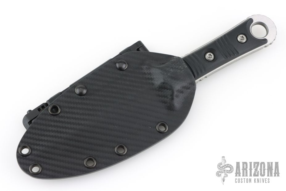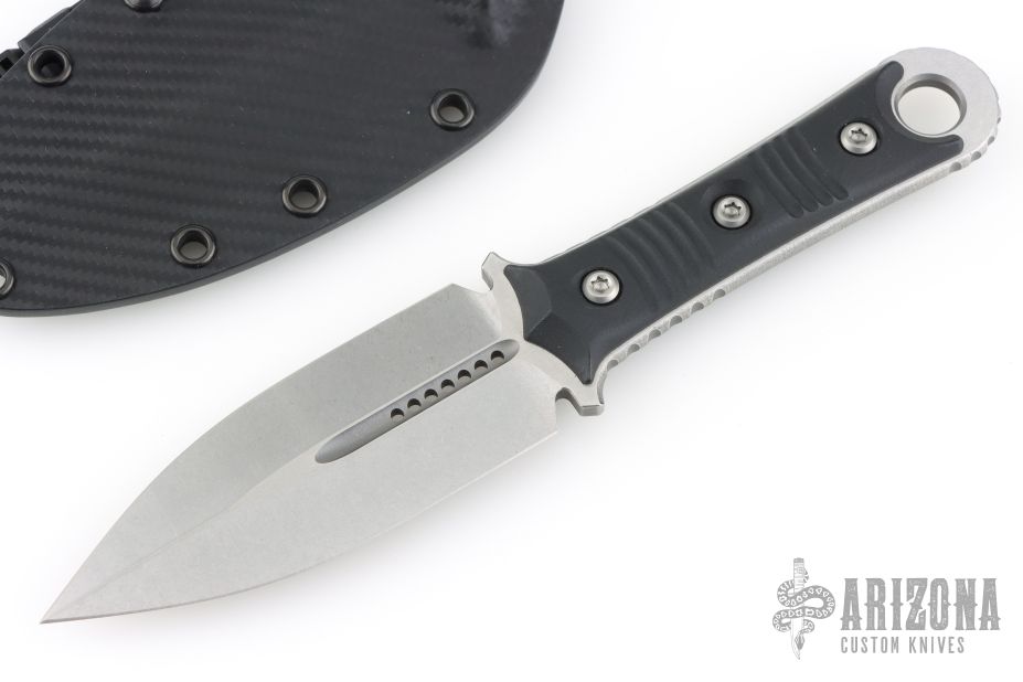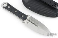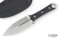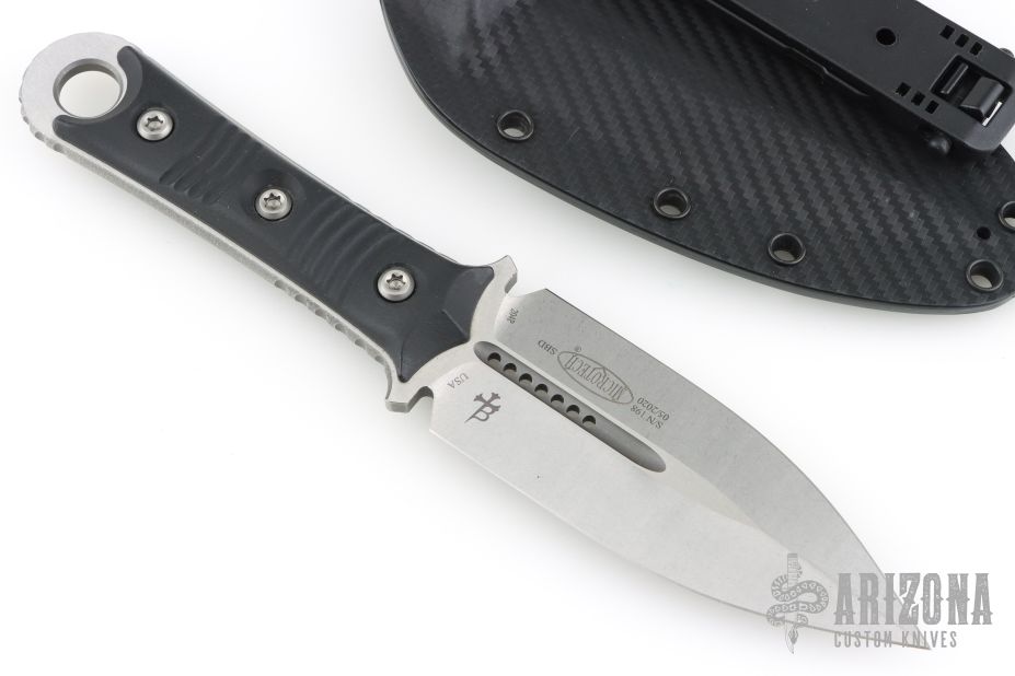 This SBD by Microtech Knives and Borka Blades features a stonewash finished double-edged blade with .188" blade stock and 1.556" blade depth, full tang construction with black G-10 scales. Comes with the original kydex sheath, dated 05/2020 s/n 210. Excellent Condition.