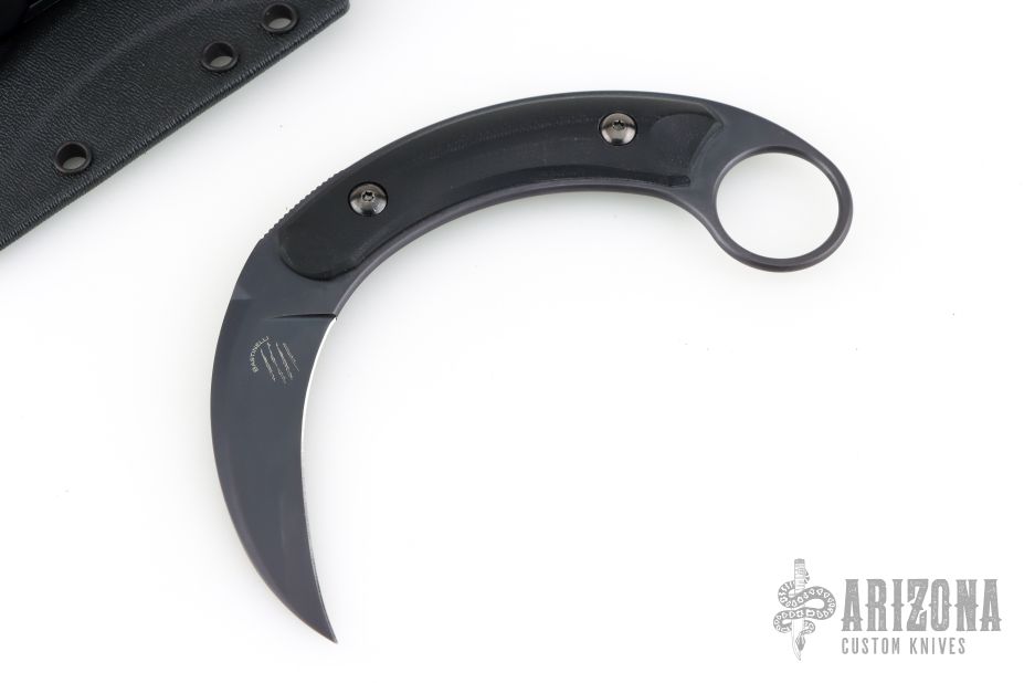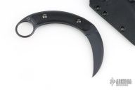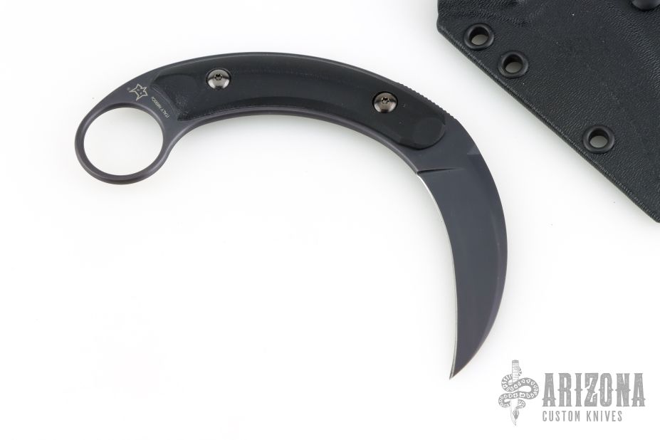 This Kalinou from Bastienlli Creations (made by Fox cutlery) features a black hawkbill style blade with swedge. The handle is comprised of black G10 scales over full tang construction with a 1" finger hole in the exposed tang pommel. Includes original sheath. Has a couple light scuffs, excellent condition.