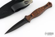 This Galvo Dagger by Les George features an Black ceracoated double-edged blade with .170" blade stock and .894" blade depth, full tang construction. The handle has black/orange G-10 scales and a lanyard hole. Comes with a black leather sheath by Chatanooga Leatherworks. Has a couple light scuffs, otherwise Excellent Condition.