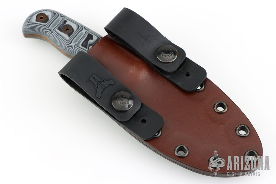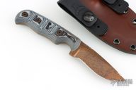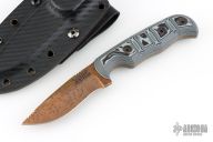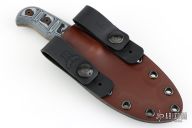 This Knife by Barry Dawson features a drop point recurve blade with notched thumbrest, .140" blade stock and .960" blade depth, full tang construction. The handle has black/gray G10 scales. Comes with a kydex sheath. Excellent condition. #318